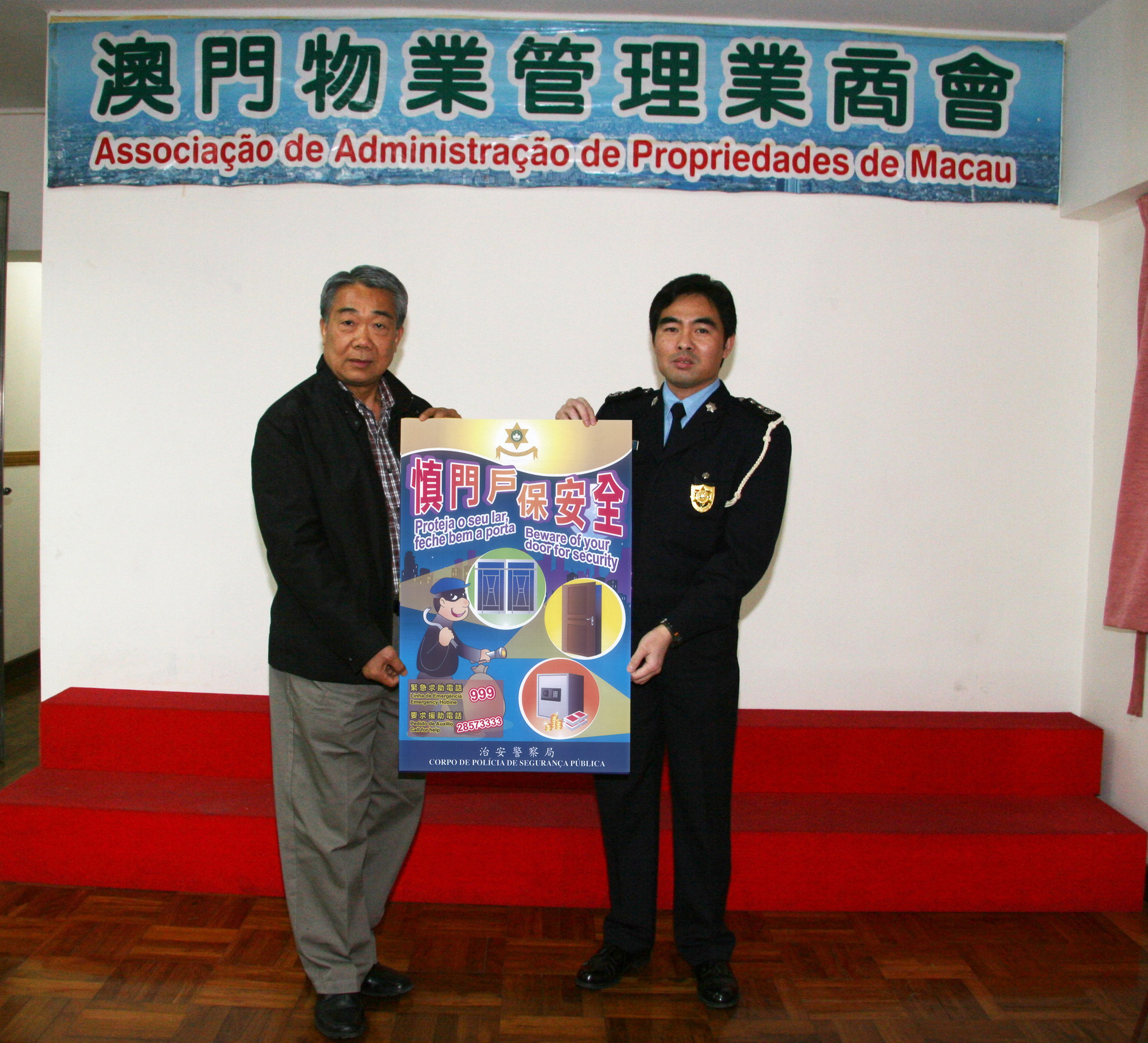 為了在歲晚期間宣傳“慎門戶,保安全”的防罪意識,治安警察局於今天(1月16日)下午三時三十分,拜訪了澳門物業管理業商會及進行會議,期間本局贈送了“慎門戶,保安全” 的宣傳海報和小冊子予該商會,目的是透過物業管理範疇的協助,加強市民的防罪意識。席間雙方交換意見並探討了區內的青少年問題。