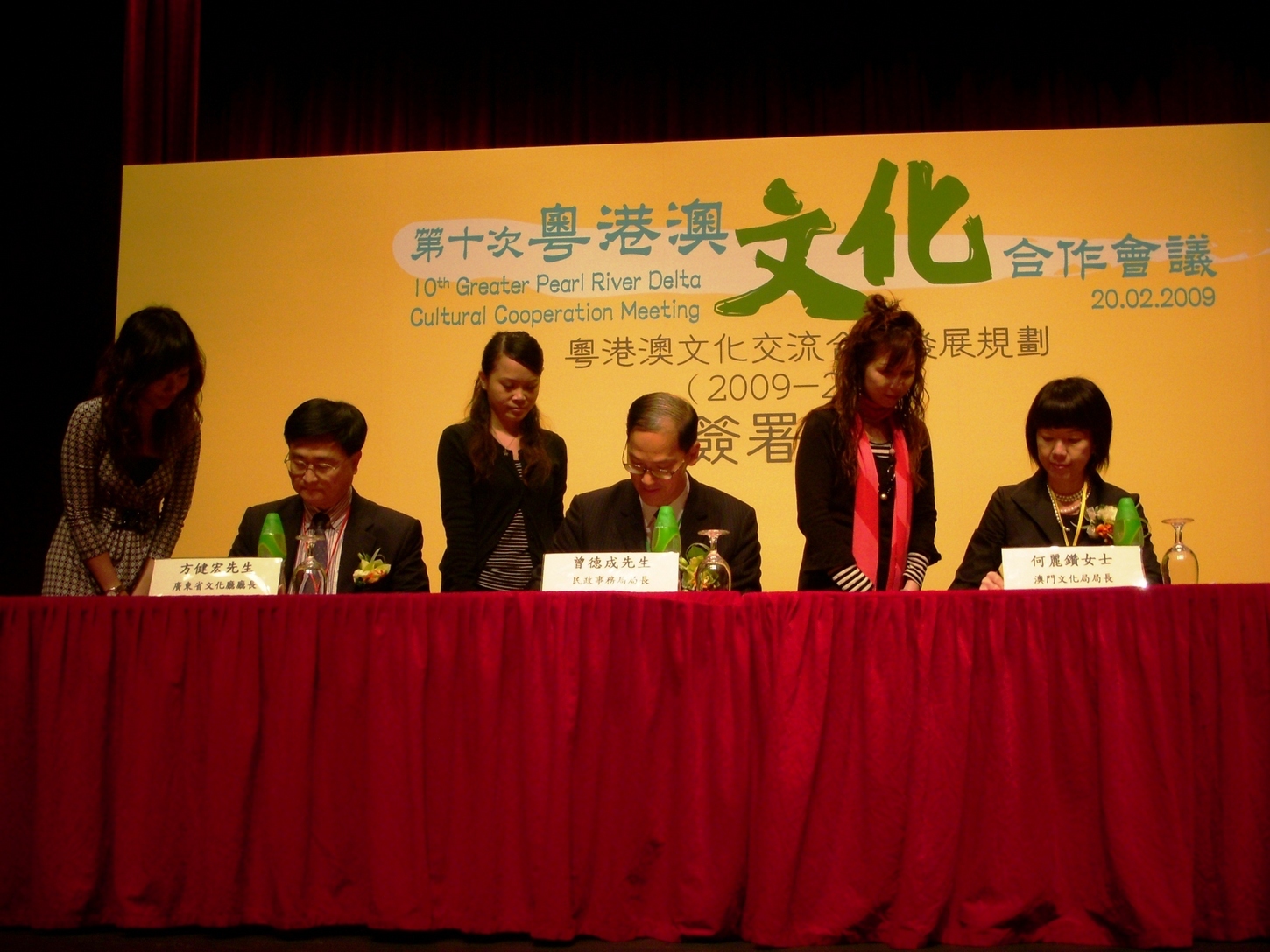 三地官員昨日在香港召開第十次會議,總結過往交流合作經驗,繼續就六項文化領域進行分組討論,與會者逾二百人。為落實及發展三地共同的文化合作願景,以廣東省文化廳廳長方健宏、香港民政事務局局長曾德成及澳門文化局局長何麗鑽為代表,在會上簽署《粵港澳文化交流合作發展規劃(2009至2013)》,為未來五年定立發展計劃,提升合作層次,制定目標,擴大合作,將進一步整合利用三地各自的優勢,積極打造大珠三角文化品牌。