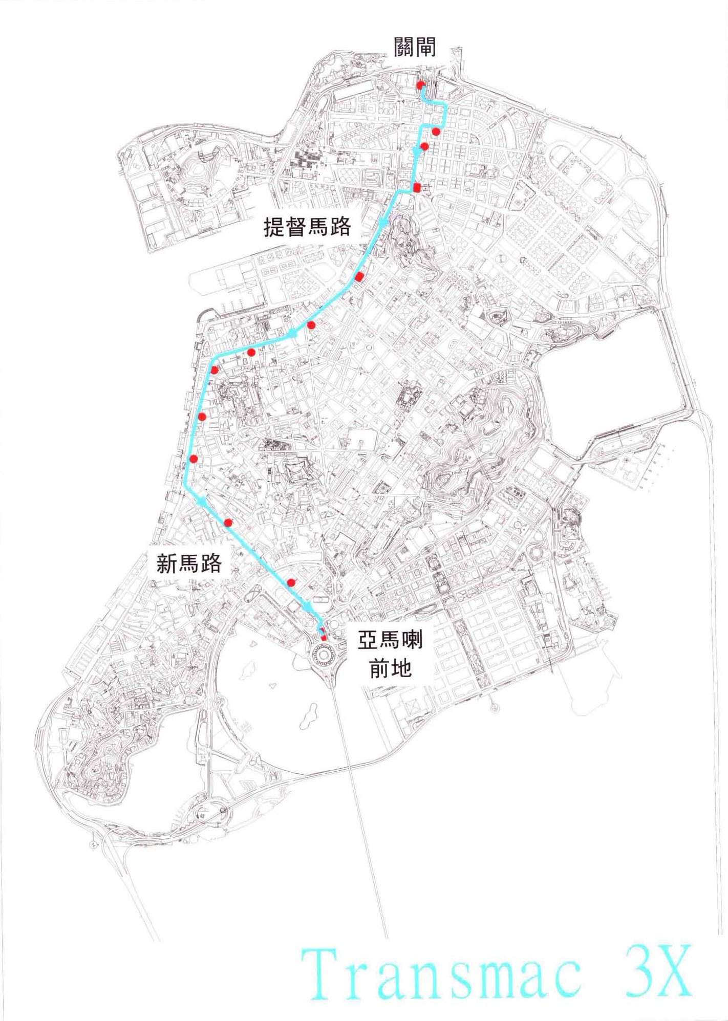 3X 關閘總站→看台街/騎士馬路→關閘馬路→三角花園→提督馬路/雅廉訪→昌明花園→土地廟前地→水上街市/中銀→海邊新街→栢港停車場→新馬路/營地大街→殷皇子馬路→亞馬喇前地