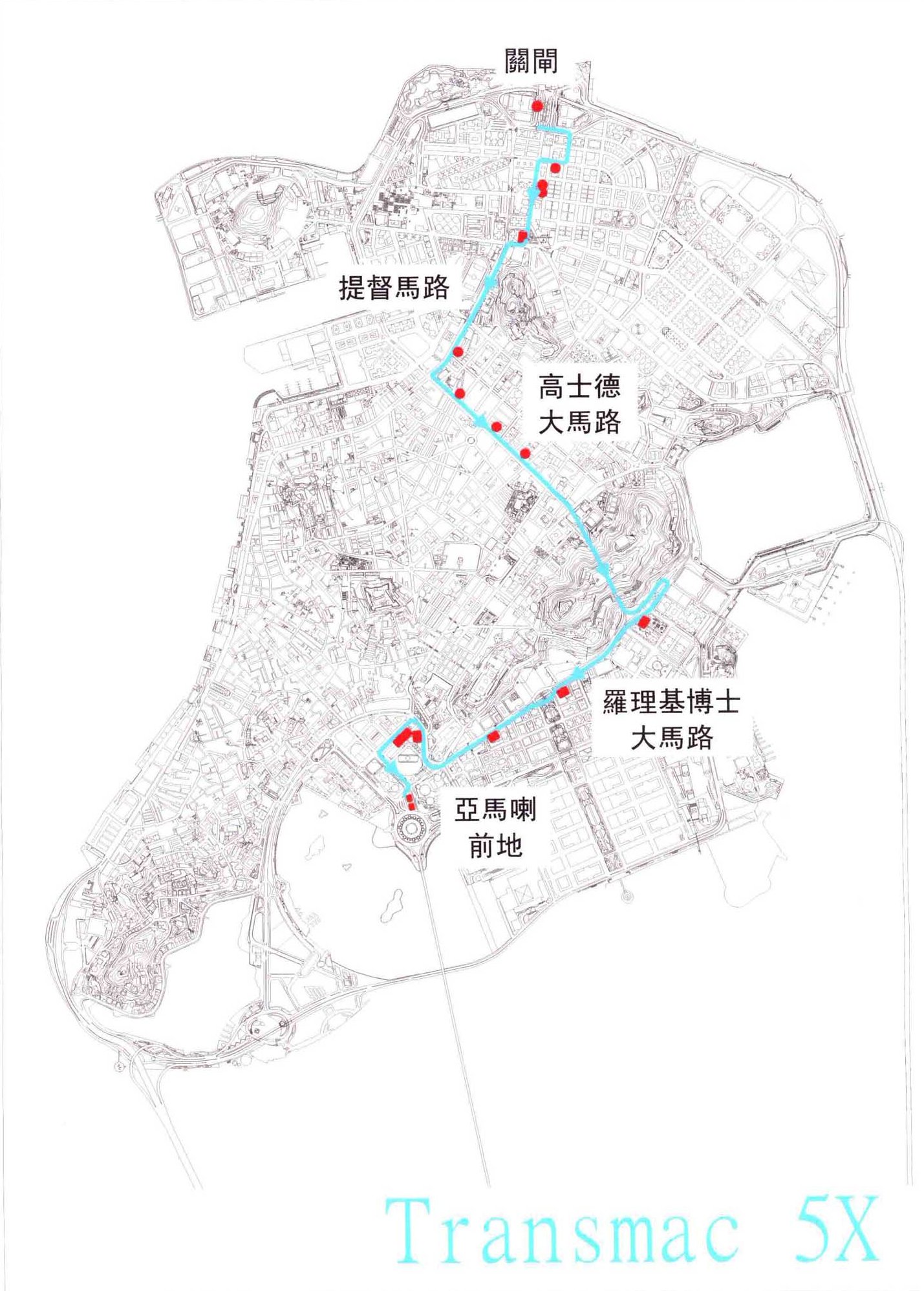 5X 關閘總站→看台街/騎士馬路→關閘馬路→三角花園→提督馬路/雅廉訪→高士德/連勝→高士德/大西洋→高士德/賈伯樂→羅理基/馬六甲街→東方拱門→治安警察局→教育暨青年局→約翰四世大馬路→亞馬喇前地