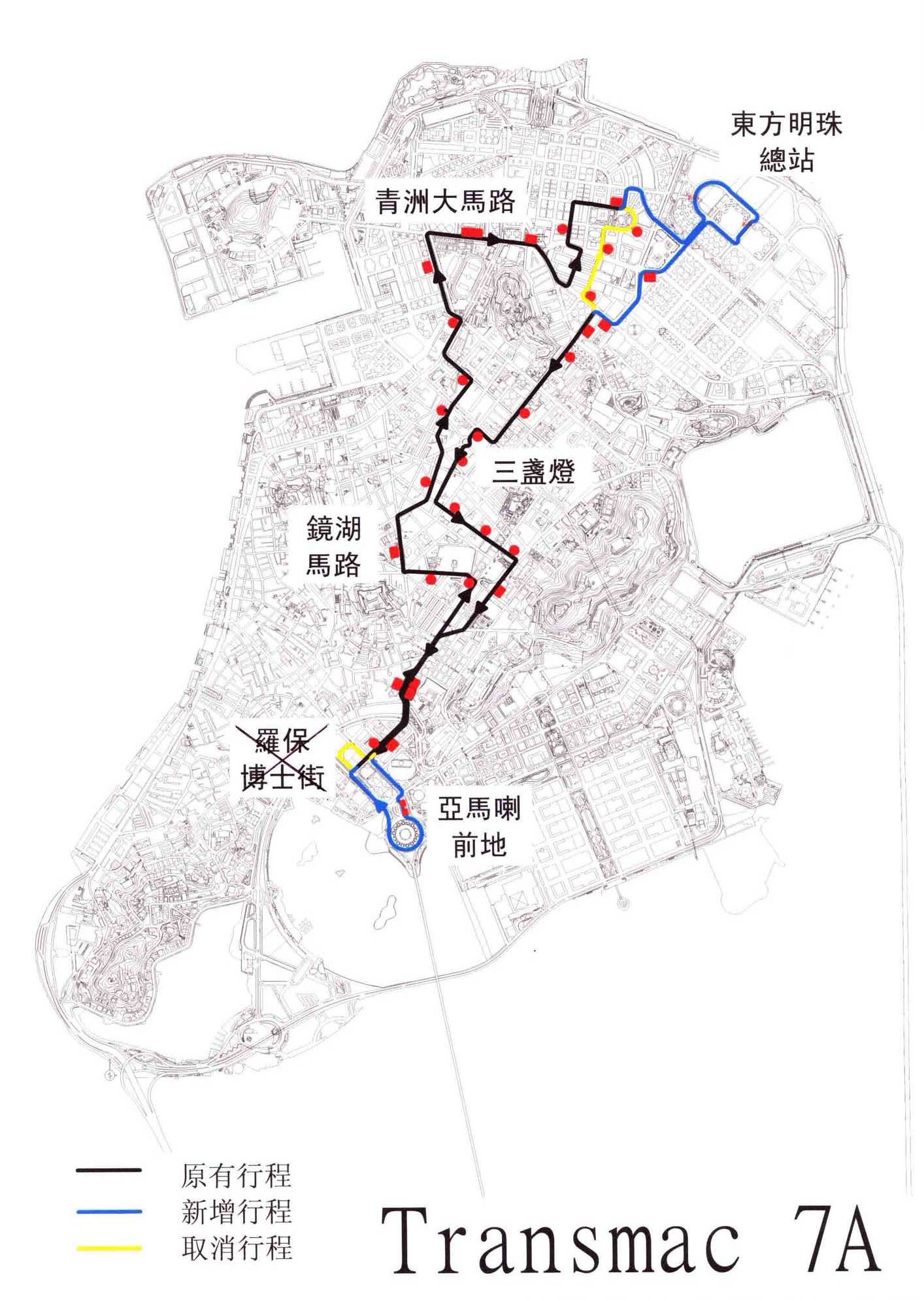 7A路線去程:東方明珠總站、黑沙環新街、高利亞海軍上將大馬路、俾利喇街、亞利鴉架街、沙嘉都喇賈罷麗街、東望洋街、水坑尾街、約翰四世大馬路、亞馬喇前地。回程:亞馬喇前地、約翰四世大馬路、水坑尾街、西墳馬路、鏡湖馬路、連勝馬路、提督馬路、白朗古將軍大馬路、青洲大馬路、祐漢第二街、菜園街、黑沙環中街、東方明珠總站。班次頻率及服務時間:每15-25分鐘一班(由早上7時30分至晚上7時)