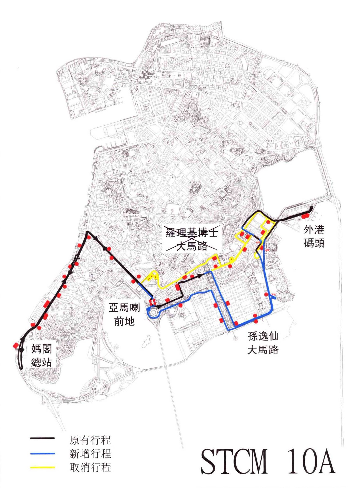 10A路線由媽閣開出到達北京街後,改經宋玉生廣場、孫逸仙大馬路、馬六甲街往外港碼頭,不經高美士街、友誼巷。由外港碼頭開出後改經孫逸仙大馬路、宋玉生廣場、亞馬喇前地往新馬路,不經畢士達大馬路、高美士街、羅理基博士大馬路、約翰四世大馬路。班次頻率方面,將由原來的每50分鐘提升至每35-40分鐘一班。