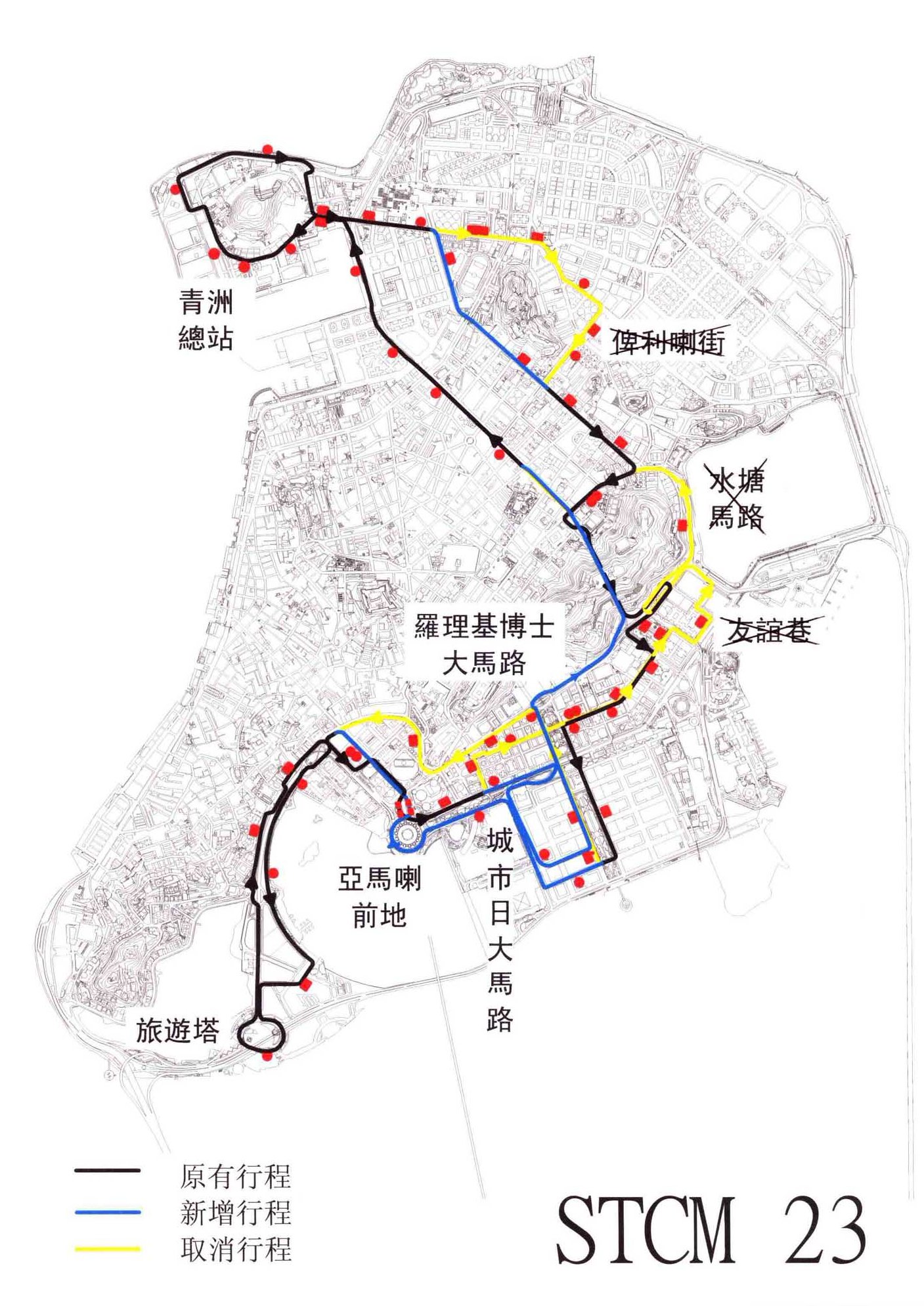23路線由青洲開出後改經白朗古將軍大馬路往美副將大馬路,不經三角花園、慕拉士大馬路、俾利喇街;到達宋玉生公園後改經柏嘉街、城市日大馬路、亞馬喇前地、殷皇子大馬路往旅遊塔,不經皇朝廣場、東方拱門、羅理基博士大馬路、教青局。由旅遊塔開出到達藝園後改經仙德麗街、城市日大馬路、宋玉生廣場、東方拱門、松山隧道往高士德大馬路,不經廣州街、北京街、高美士街、友誼巷、水塘馬路、士多鳥拜斯大馬路。班次頻率及服務時間調整為每20-25分鐘一班(由早上6時30分至晚上7時30分)及每33-38分鐘一班(由晚上7時30分至11時20分)。