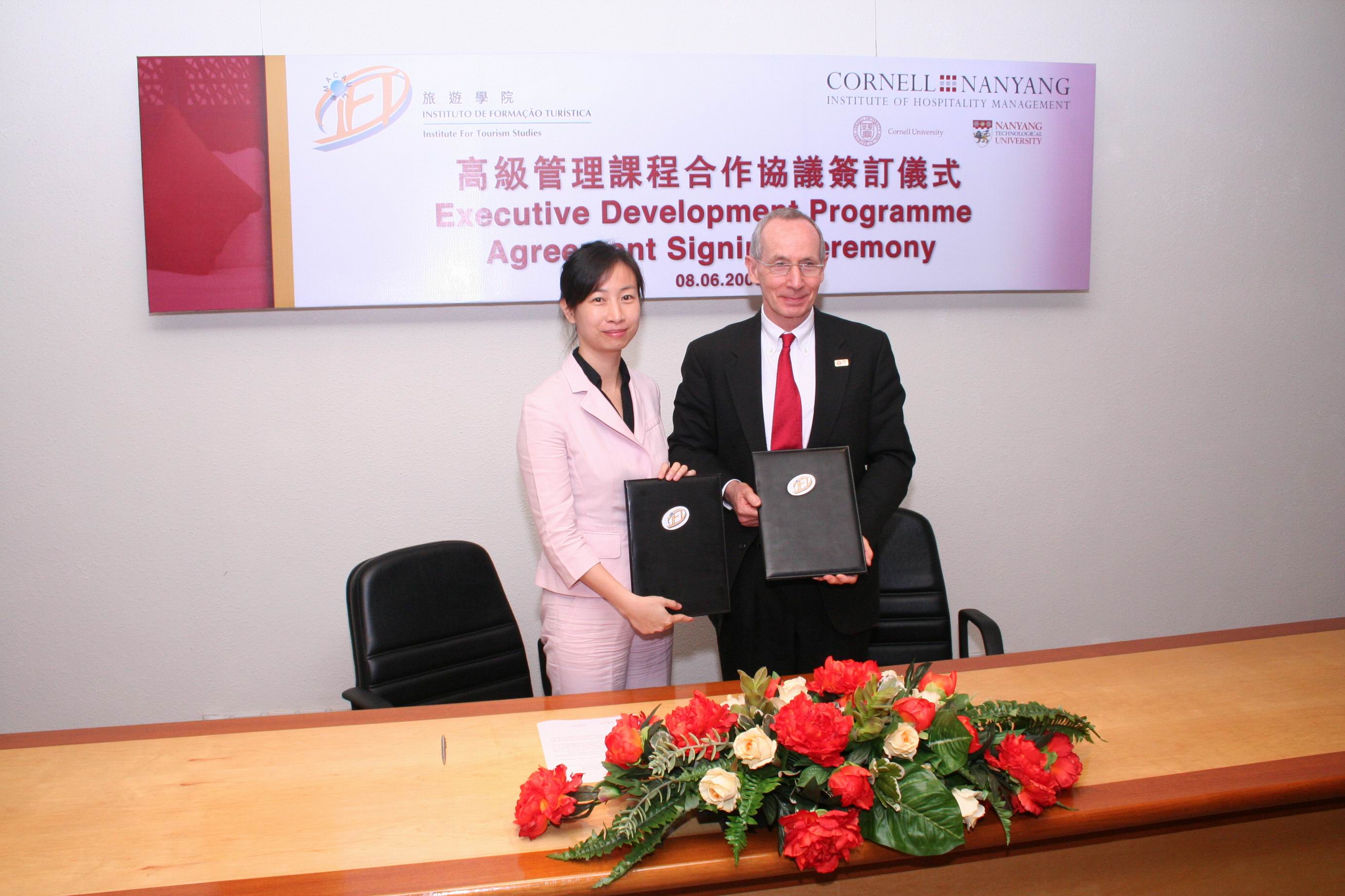 澳門旅遊學院與新加坡「康奈爾 – 南洋款待管理學院」(Cornell-Nanyang Institute of Hospitality Management)是日於旅遊學院簽訂高級管理課程合作協議。簽署儀式由旅遊學院院長黃竹君博士及「康奈爾 – 南洋款待管理學院」署理院長Russell Arthur Smith博士主持。