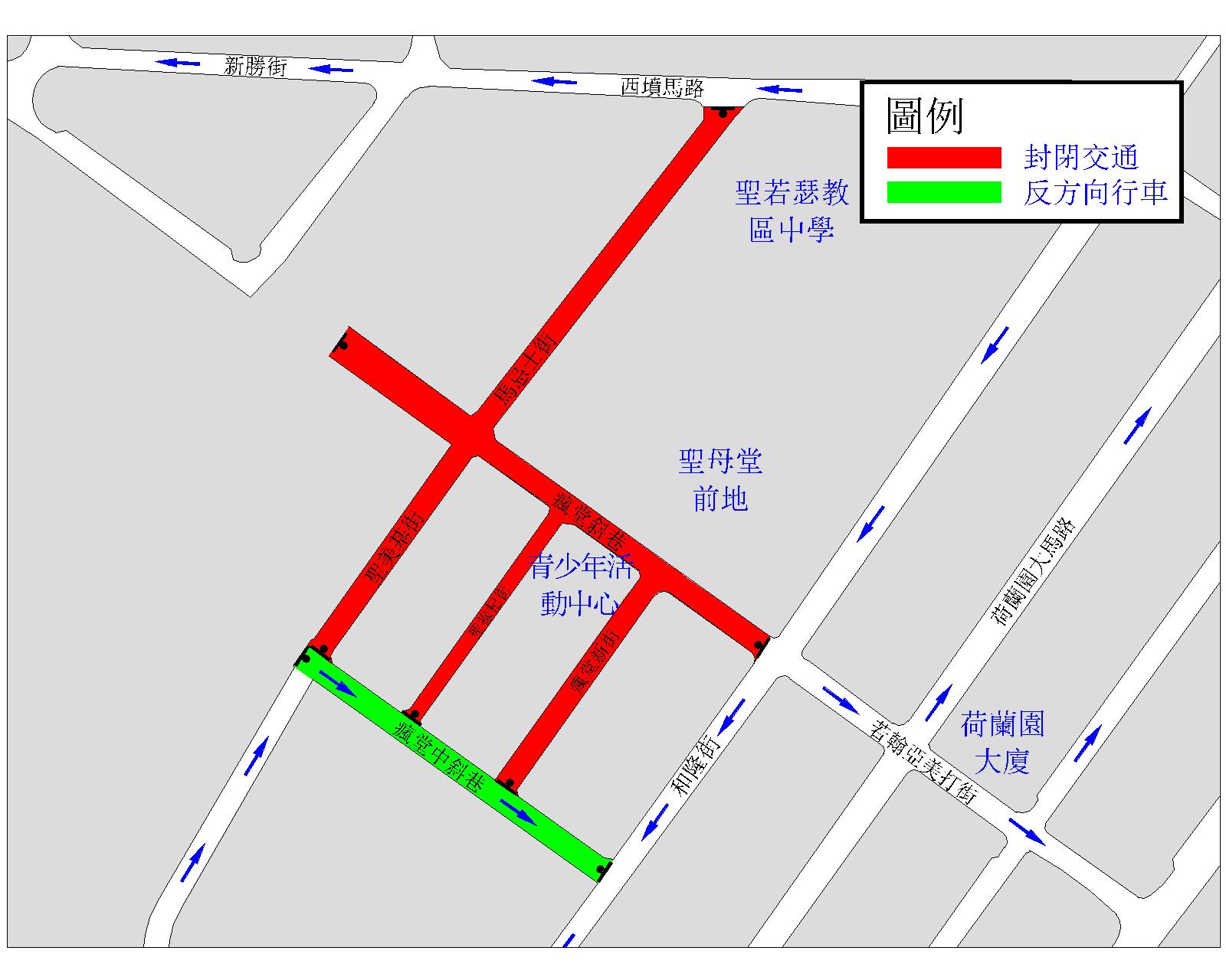 因應有團體將在望德堂區舉辦活動,多條相關道路將於26日(周五)至29日(周一)實施臨時交通改動,其中介乎美珊枝街與和隆街之間的一段瘋堂斜巷將於26日及29日實施有限度通車,並於27日(周六)上午11時至28日(周日)晚上12時封閉交通,除緊急服務車輛及特許車輛外,其餘車輛禁止駛入;而介乎瘋堂斜巷與西墳馬路之間的馬忌士街、介乎瘋堂中斜巷與瘋堂斜巷之間的聖美基街、聖祿杞街及瘋堂新街亦會同時封閉,上述道路的部分車位亦會禁止車輛停泊。另外,介乎聖美基街與和隆街之間的一段瘋堂中斜巷,將於27日上午11時至28日晚上12時實施反方向行車,車輛需由聖美基街往和隆街方向行駛,活動期間,准許相關活動車輛停泊在瘋堂新街。