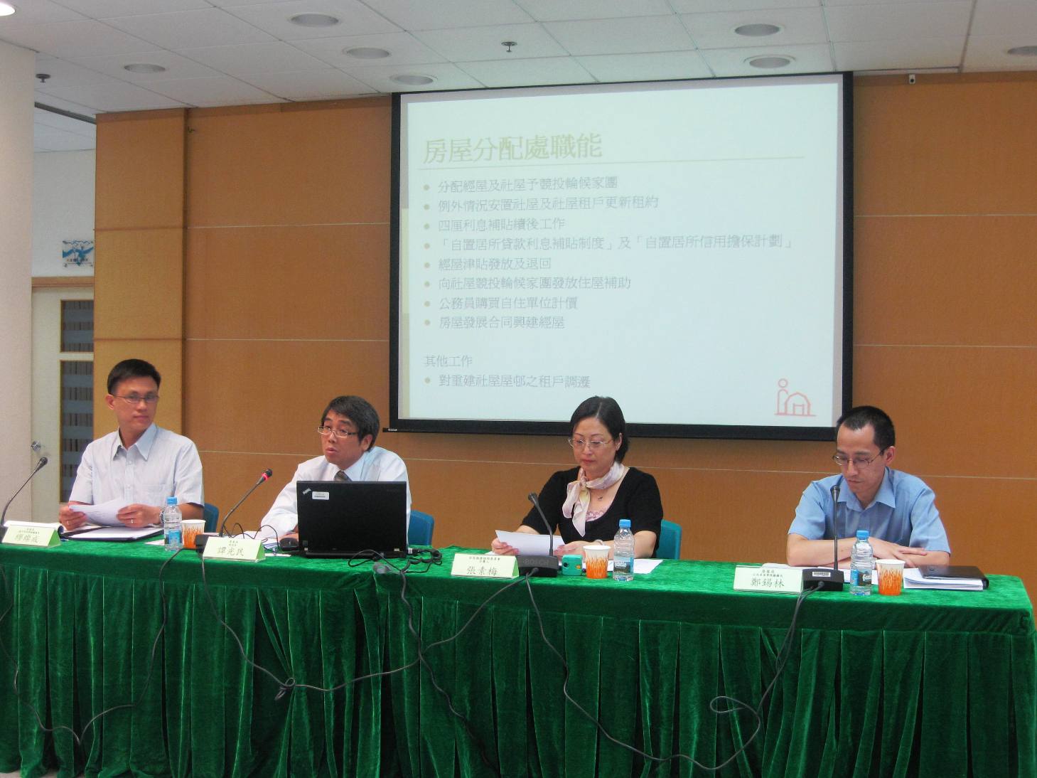 職能簡介會日前於營地活動中心舉行,房屋局副局長譚光民、公共房屋事務廳廳長鄭錫林及樓宇管理事務廳廳長繆燦成,向社諮會介紹房屋局的架構職能、各項樓宇維修基金計劃以及樓宇滲漏水聯合處理中心處理投訴的情況,出席的社諮會成員包括召集人張素梅,北區社諮會副召集人吳素寬、楊達威,離島區社諮會副召集人黃永曦、冼志陽以及各區社諮會委員。