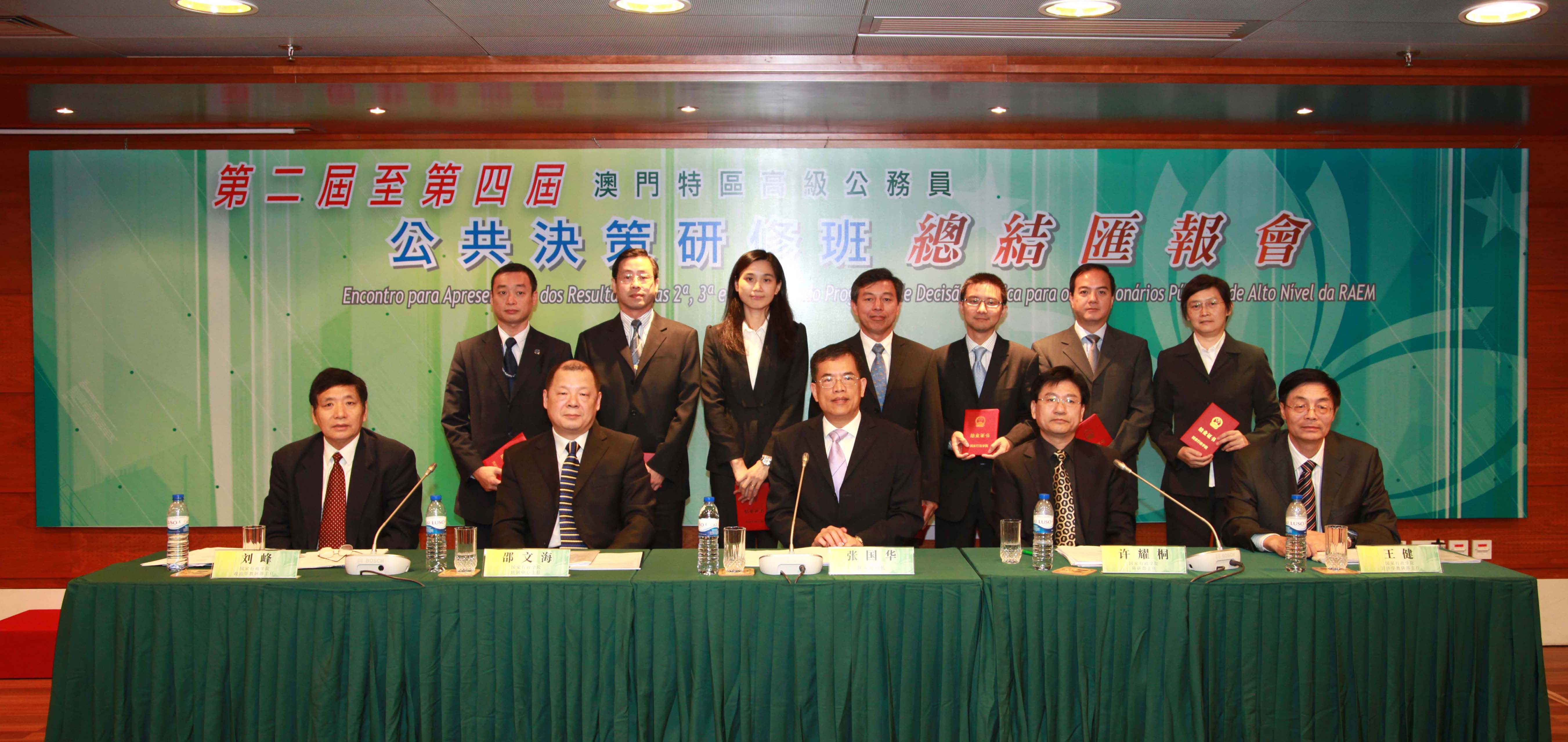 “澳門特區高級公務員公共決策研修班”是國家行政學院為澳門特區高級公務員而設計的重點培訓項目,對象為特區政府的領導級官員。學員的研究課題包括與社會民生相關的政策措施及《公共行政改革路線圖》的改革項目。該課程共分為兩個階段,第一階段是在北京國家行政學院進行5天的研討學習,第二階段在本澳就政府政策措施相關的課題進行為期約9個月的“行動學習”。