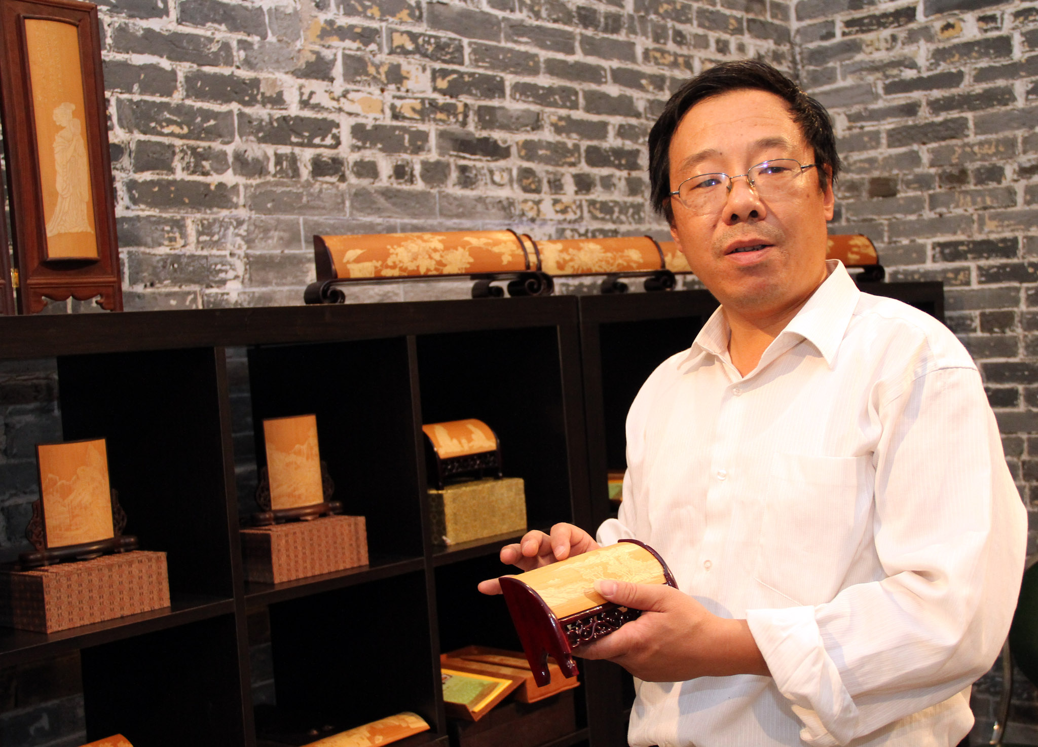 來澳工藝家邵風豐師從中國留青竹刻泰斗白士風,獲得多個全國、省工藝美術獎項,邵風豐用刀如筆,將山水、花鳥、樹石或人物等以深厚的刀法細膩呈現,現場展示的屏風、扇骨、臂擱等作品高雅淸新, 賞心悅目。