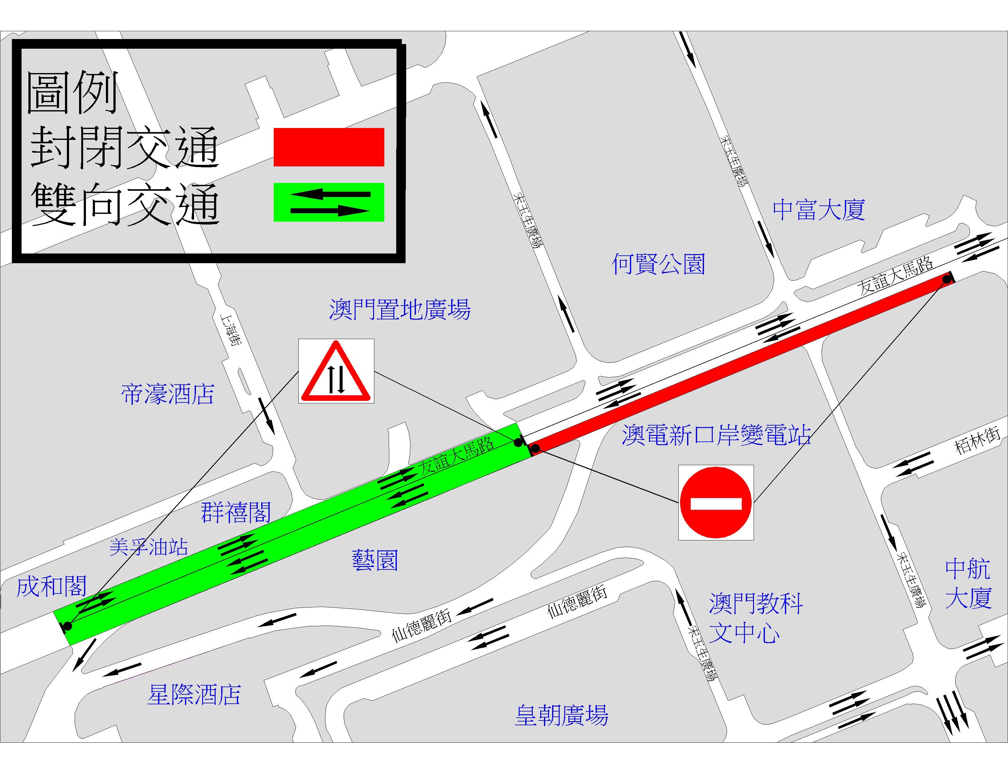 配合大賽車委員會重鋪賽車跑道的工作,本月24日(周六)早上9時30分至晚上12時,位於成和閣至中富大廈之間的一段友誼大馬路靠向藝園一側的一條行車線(包括友誼大馬路往仙德麗街的入口路段)將臨時封閉,同一時間,交通事務局將把介乎宋玉生廣場與成和閣之間的一段友誼大馬路改作臨時雙向行車,並於成和閣對開臨時開通一個缺口,以方便車輛從該缺口駛往新填海區。