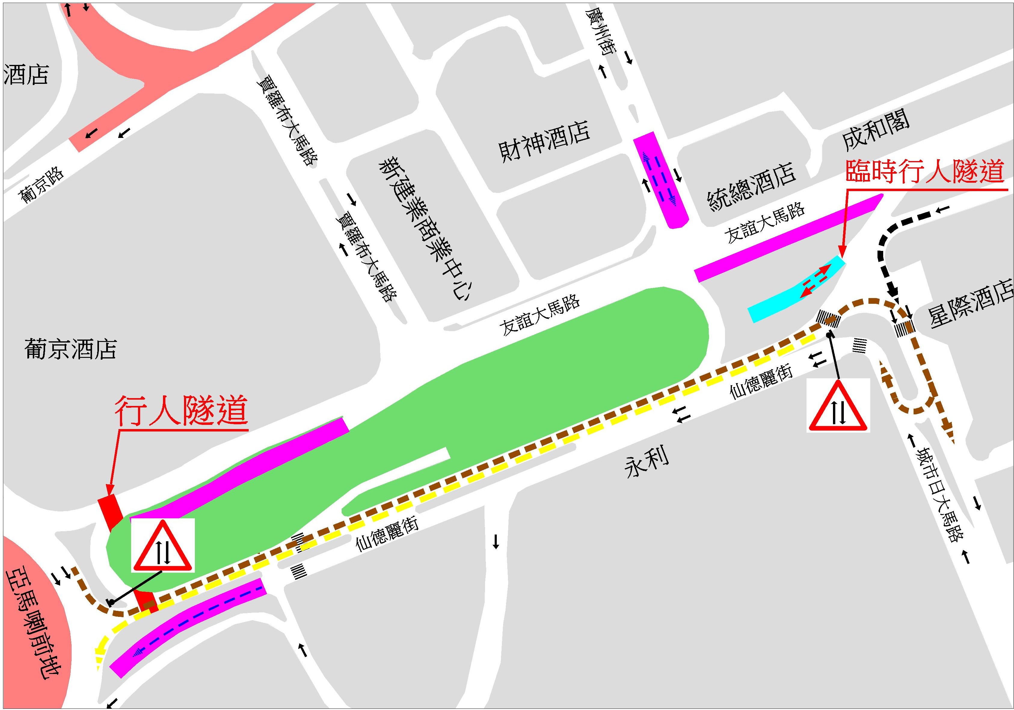 為配合大賽車舉行期間,分流經由嘉思欄行車天橋和宋玉生行車天橋往返中區與新口岸新填海區之間的交通,提高賽車跑道周邊道路的交通疏導能力,同時維持亞馬喇前地直接通往皇朝區方向的交通,以及讓道路使用者及早適應大賽車期間的臨時交通安排,由16日(周一)上午11時起,介乎亞馬喇前地與城市日大馬路之間,即位於藝園南面的一段仙德麗街將由原來的單向行車改為雙向行車,屆時於亞馬喇前地的車輛可左轉入仙德麗街再右轉直抵城市日大馬路。