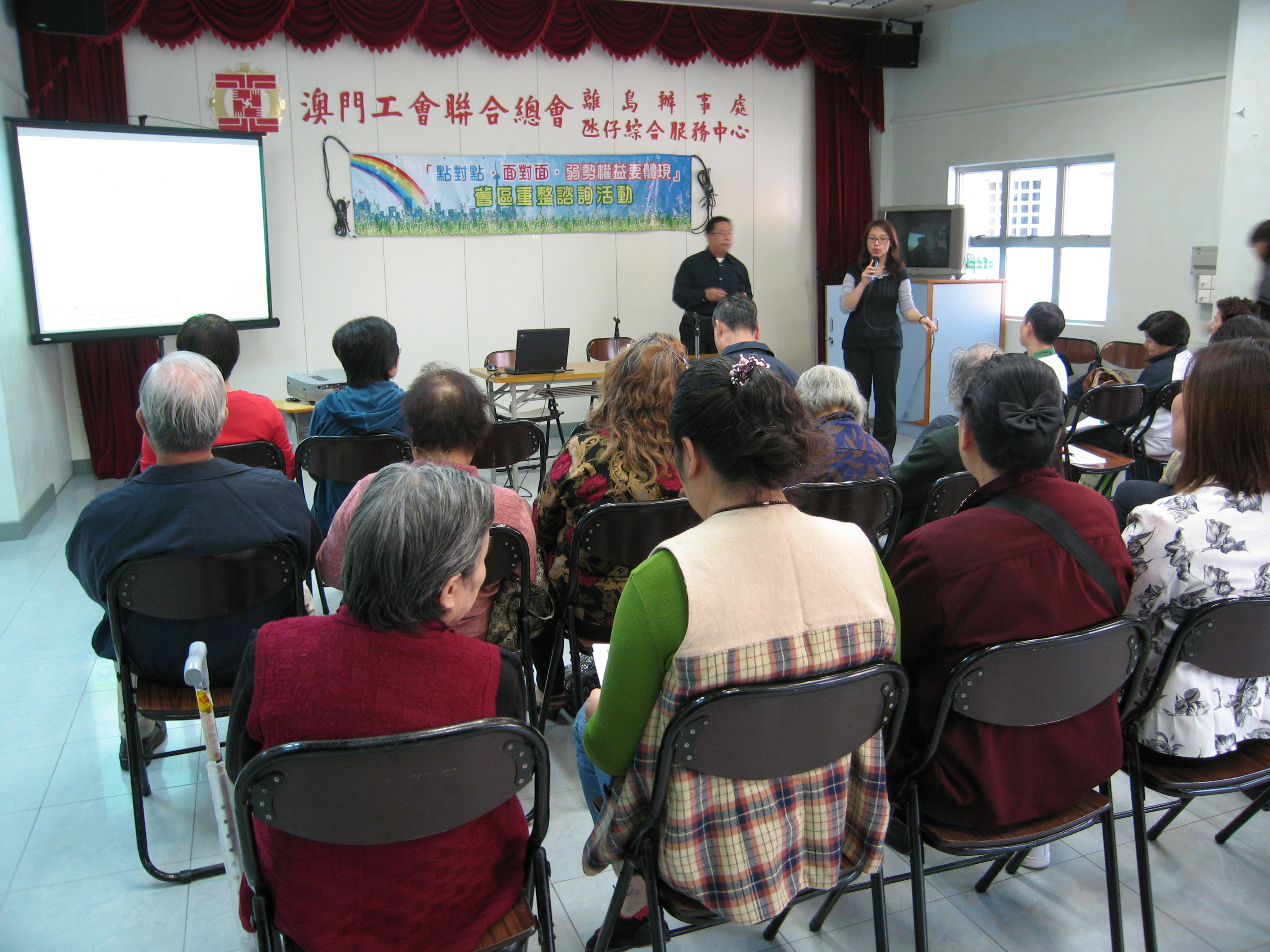 「點對點.面對面.弱勢權益要體現」是舊區重整諮詢委員會今年推行的宣傳諮詢工作之一,至今分別已舉辦了多場活動,並於日前續與街總祐漢社區中心、工聯氹仔綜合服務中心舉行座談,出席的包括街總祐漢社區中心助理主任陳新華、工聯氹仔綜合服務中心主任盧瑞儀,以及合共近百名單親家長、區內居民參與。