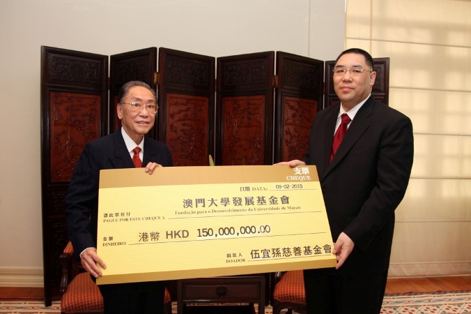 澳門大學發展基金會今日(九日)獲伍宜孫慈善基金會有限公司捐款港幣一億五千萬元正,為基金會於去年底成立以來最大筆捐款。為答謝伍宜孫慈善基金會對大學的捐贈,澳門大學新校區的中央圖書館將以伍宜孫博士之名命名。行政長官兼澳門大學校監崔世安及澳大校董會已同意此冠名安排,崔世安表示,澳大在中央和社會各界的支持下,其發展已踏上新的台階。