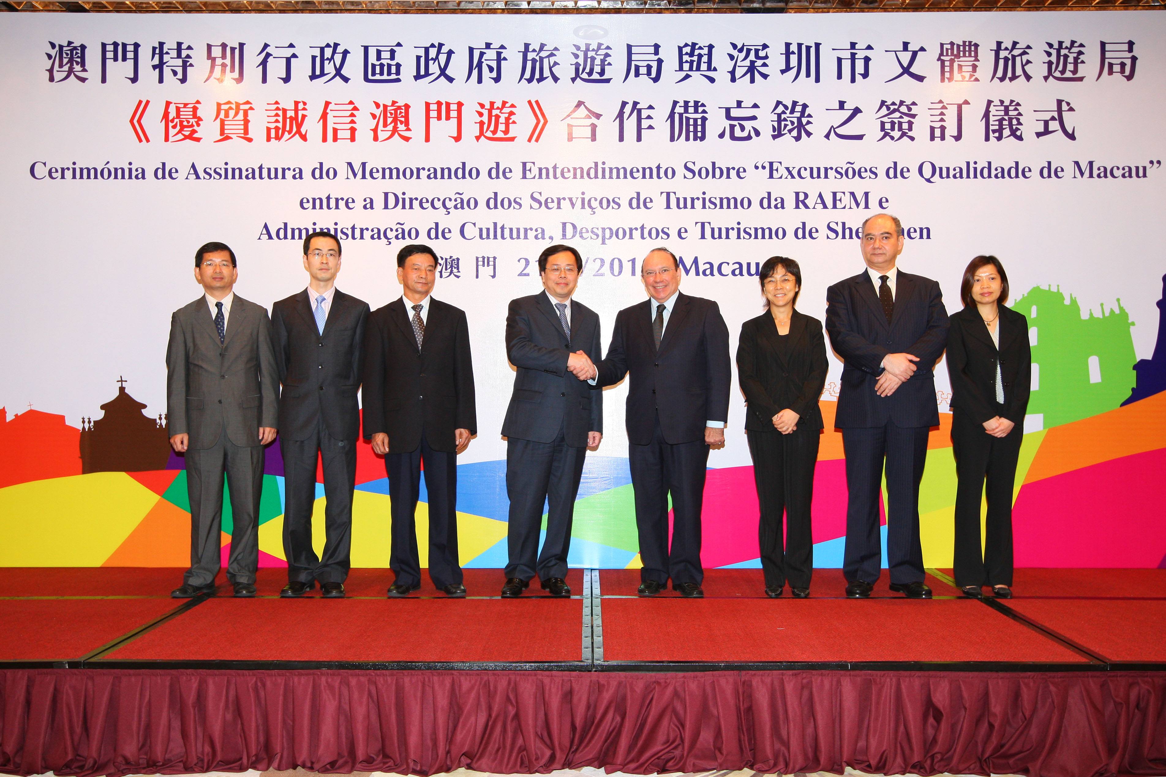 澳門特別行政區政府旅遊局今(21日)與深圳市文體旅遊局簽署“優質誠信澳門遊”合作備忘錄,希望深澳兩地旅遊業能健康發展及維護澳門遊市場秩序。