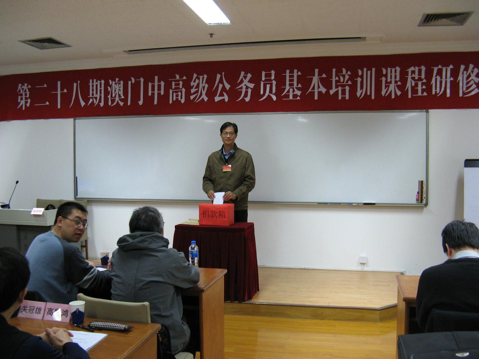 第28期澳門中高級公務員基本培訓課程研修班班長惠程勇代表全體學員把善款投進國家行政學院密封的捐款箱。