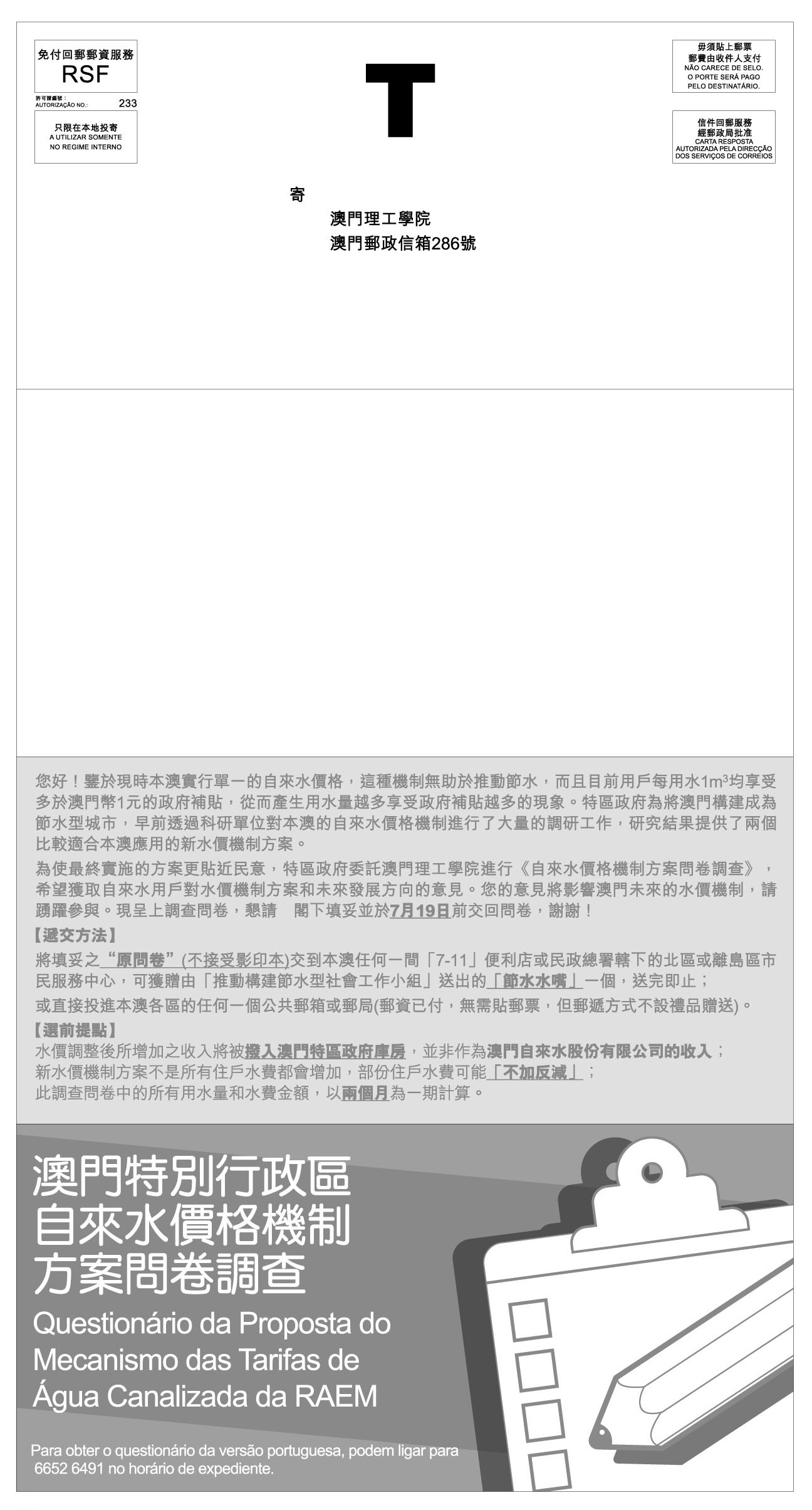小組呼籲受訪戶盡公民權利及義務配合問卷調查,有關意見將為特區政府制定新水價機制方案時提供重要的參考。受訪戶欲了解更多“自來水價格機制諮詢方案”以及154個問卷收件點的詳細地址,可瀏覽小組網頁(http://www.marine.gov.mo/waterconservation)。