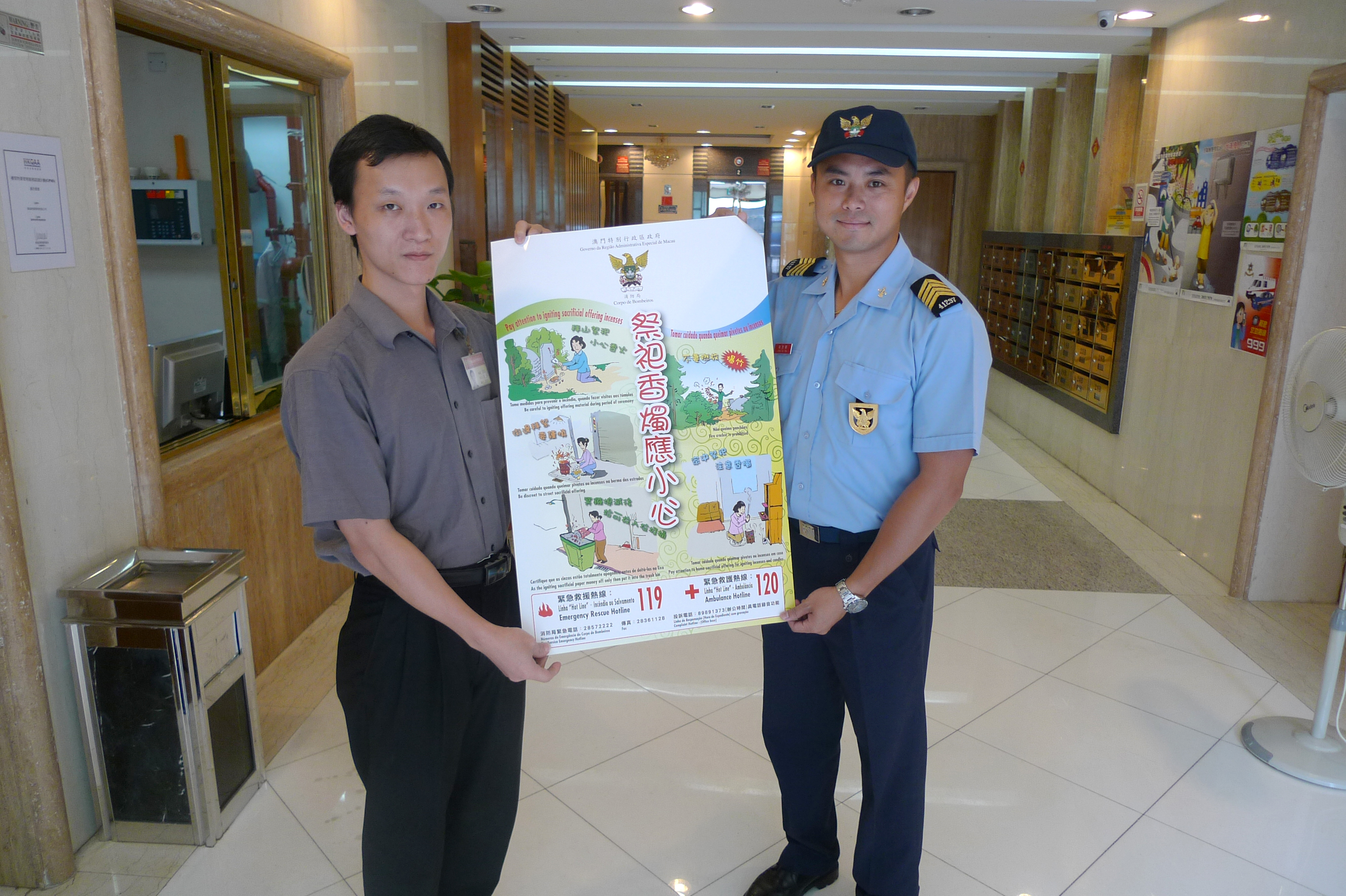 踏入農曆七月份,按照中國的全統習俗,市民會進行祭祀活動並會燃燒冥鏹;有見及此,消防局人員於本年8月16至20日期間(盂蘭節前),在防火宣傳車的配合下,於關閘、台山、青洲、及筷子基及高士德等地區,派發“祭祀香燭應小心”宣傳單張及海報,目的是希望透過是次防火宣傳活動,加強市民的防火安全意識,避免因有關祭祀活動而造成火災的危險。
