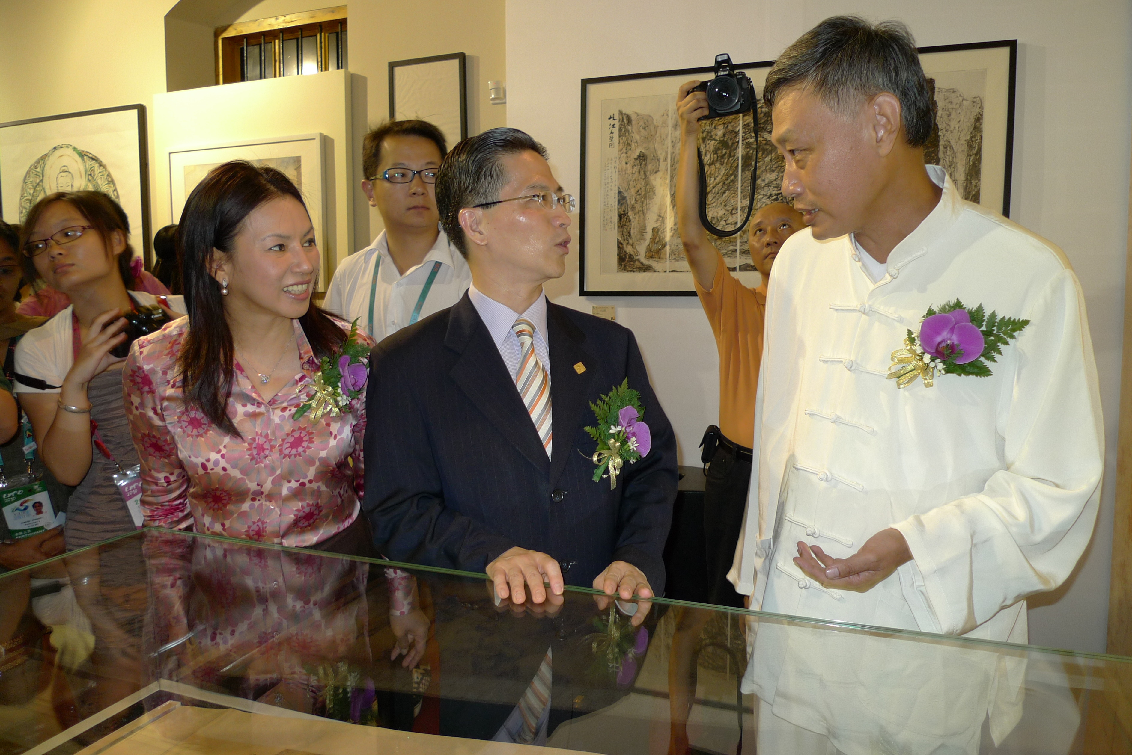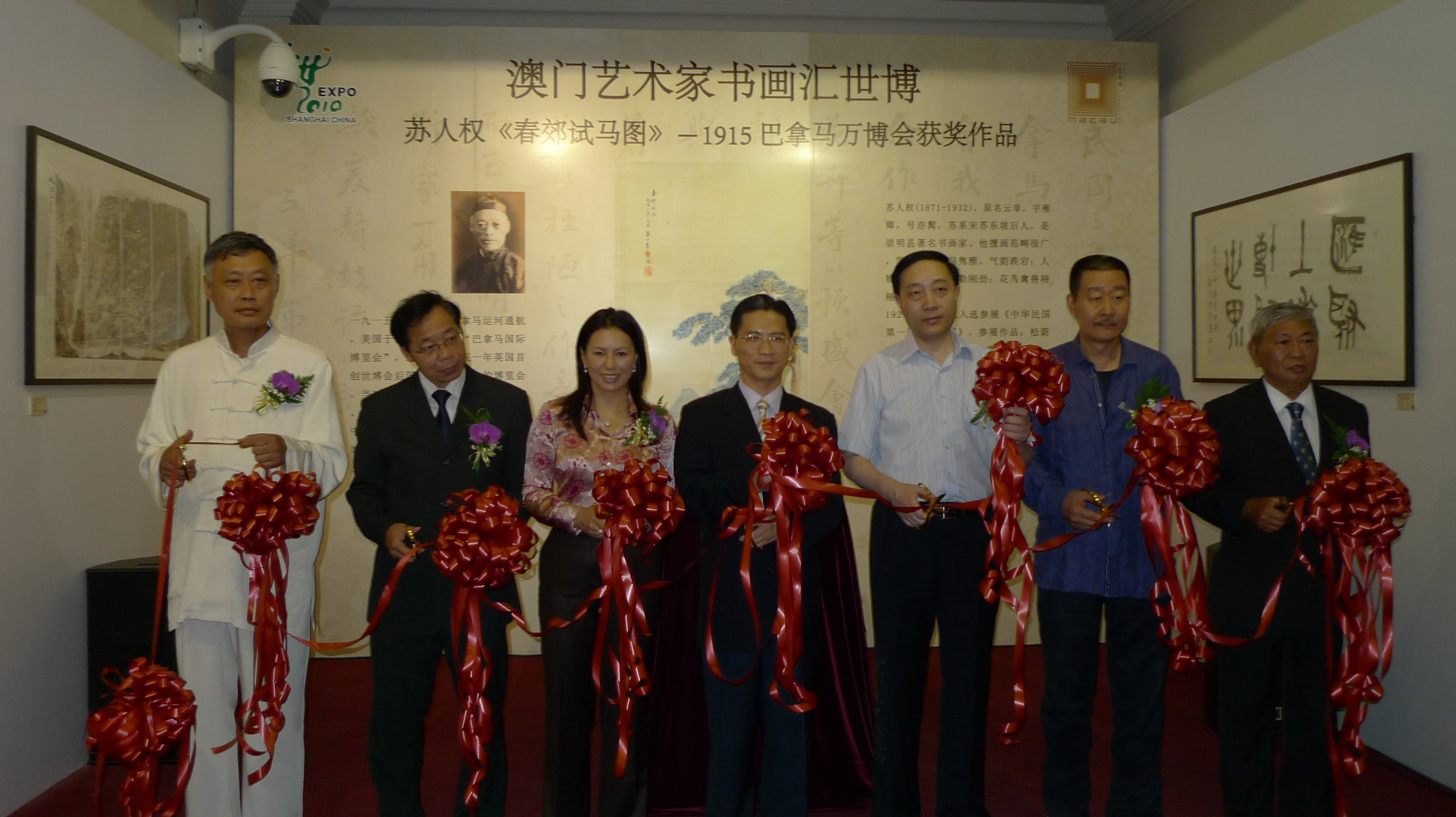 由上海世界博覽會澳門籌備辦公室主辦,澳門美術協會協辦的“澳門藝術家書畫作品匯世博"開幕儀式,今(22)日下午在上海世博澳門德成按案例館舉行,上海世博會執行委員會副主任周漢民、澳門特區政府上海世博會澳門籌備辦公室主任楊寶儀、上海市外事辦主任李銘俊、澳門美術協會會長黎鷹、澳門書畫研究院院長孫蔣濤、著名晝家蘇民、澳門松風文化藝術協會副會長蘇鑒良等主持了剪綵儀式。