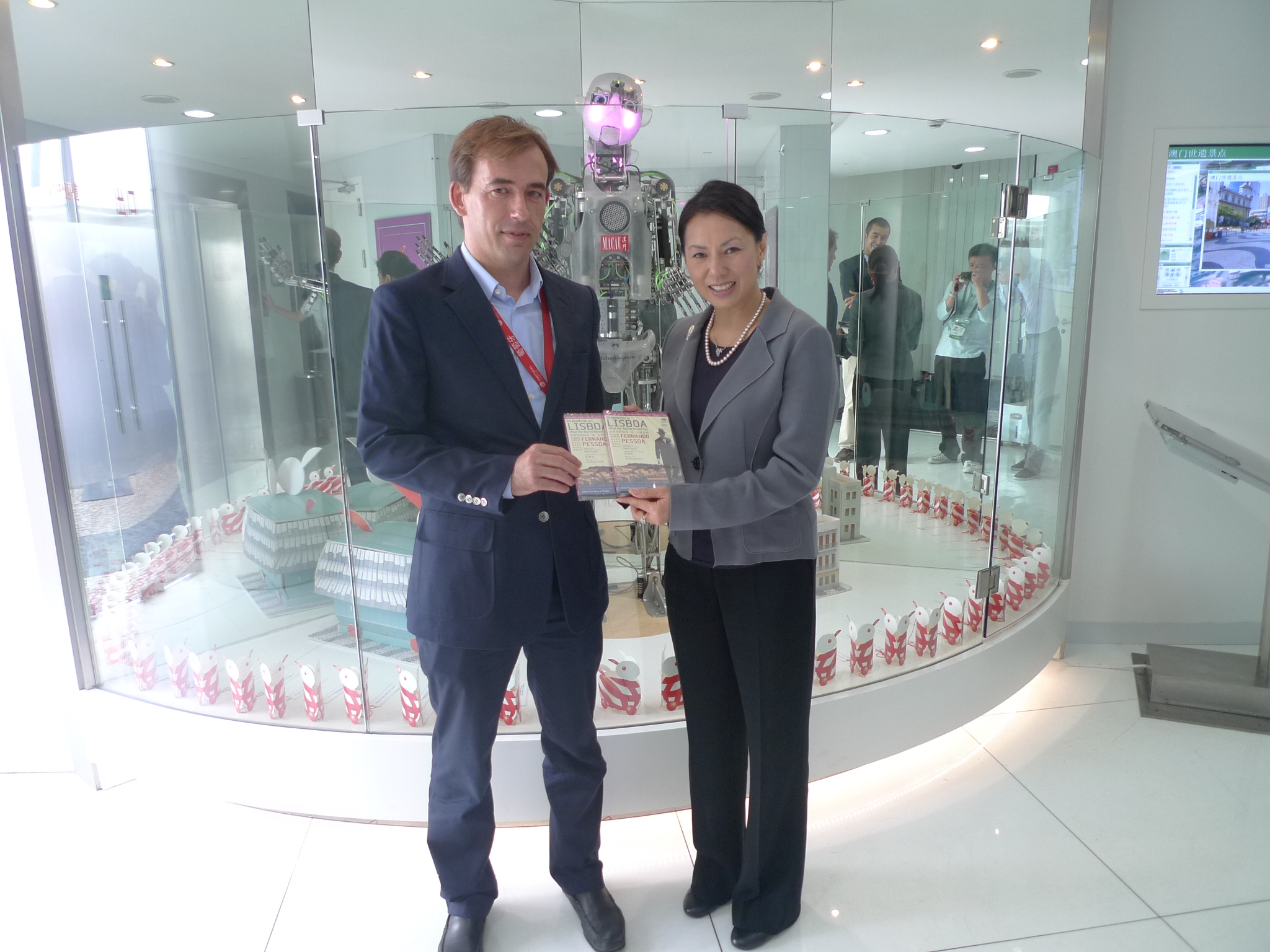 上海世博葡萄牙館館長若澤.弗拉高索(José Fragoso)今(20)日到訪澳門館,代表里斯本市長向澳門學生致贈1,500張《里斯本的秘密》影片光碟,上海世博澳門籌備辦公室主任楊寶儀代表接受該批光碟。