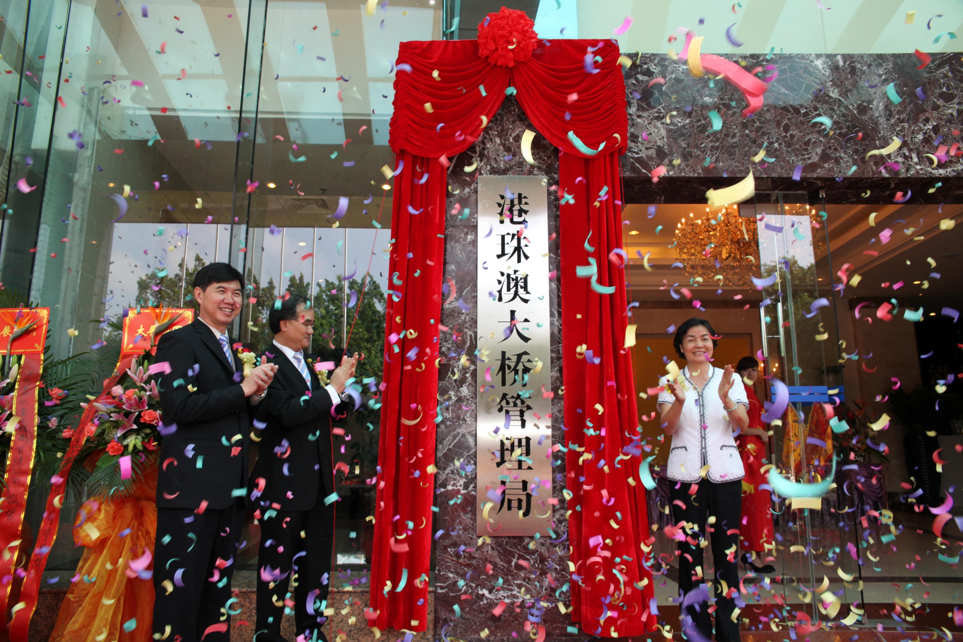 9月27日上午,港珠澳大橋管理局揭牌儀式在珠海九州港大廈舉行。港珠澳大橋三地聯合工作委員會召集方首席代表、廣東省發改委主任李妙娟和香港方首席代表、香港運輸及房屋局副局長邱誠武,澳門方首席代表、澳門建設發展辦公室主任陳漢傑和珠海市市長鐘世堅一起參加了揭牌儀式。參加揭牌儀式的還有廣東省交通廳副廳長蔡啟文,珠海市常務副市長何甯卡,香港路政署署長劉家強,香港運輸署副署長程錦昌,澳門交通事務局副局長鄭岳威,澳門港務局海事活動廳廳長郭光華等三地委委員。
