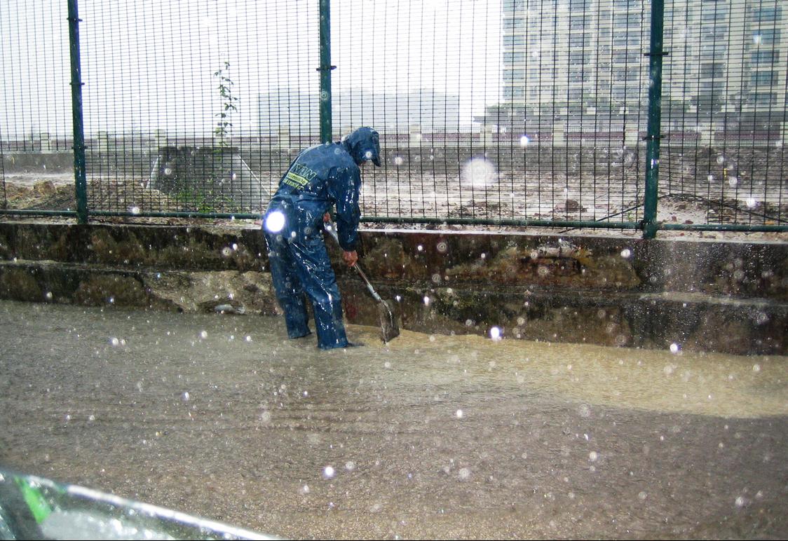 一旦風暴臨近發生水浸情況,民署亦會立即啟動應變措施,兩組緊急應變清渠小組和一組泵房機電小組會即時前往水浸地區進行緊急處理,清理雨水井內外阻礙排水的垃圾,開放砂井蓋以及啟動泵站內所有水泵,加速排走下水道的積水舒解水浸的情況。