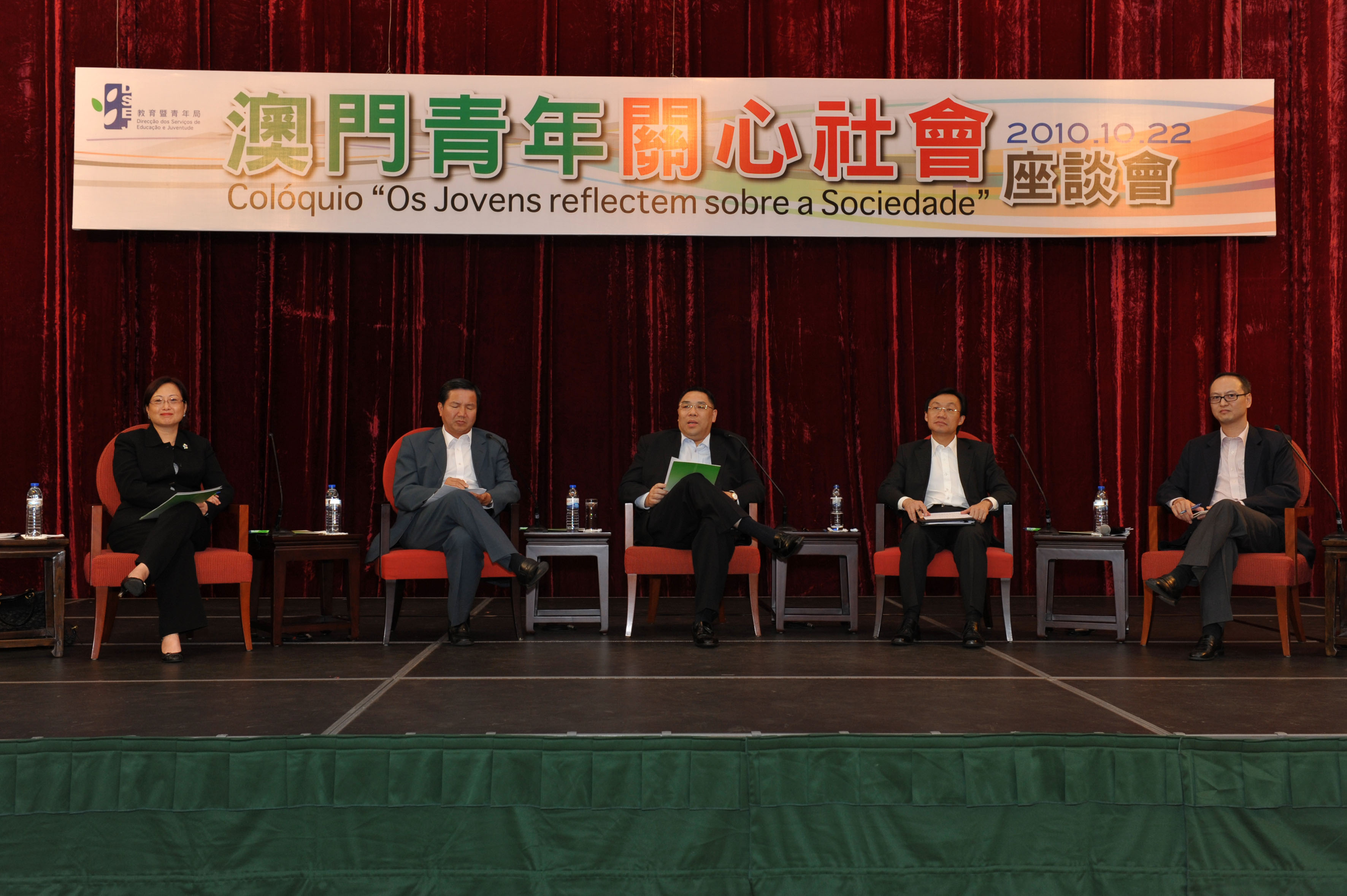 為了進一步加強特區政府與青年的溝通,鼓勵青年關心社會發展並積極表達意見,教育暨青年局於本年10月22日(星期五)晚上8時至10時,在何東中葡小學體育館舉行了主題為“青年如何配合本澳適度多元發展”的“澳門青年關心社會”座談會。當晚主辦單位特別邀請了行政長官崔世安博士、社會文化司張裕司長、行政長官辦公室譚俊榮主任、社會文化司司長辦公室張素梅主任、教育暨青年局蘇朝暉局長以及多位政府部門的領導及代表到場與青年面對面交流,深入了解青年的想法和需要,以作為制定有關政策的參考。