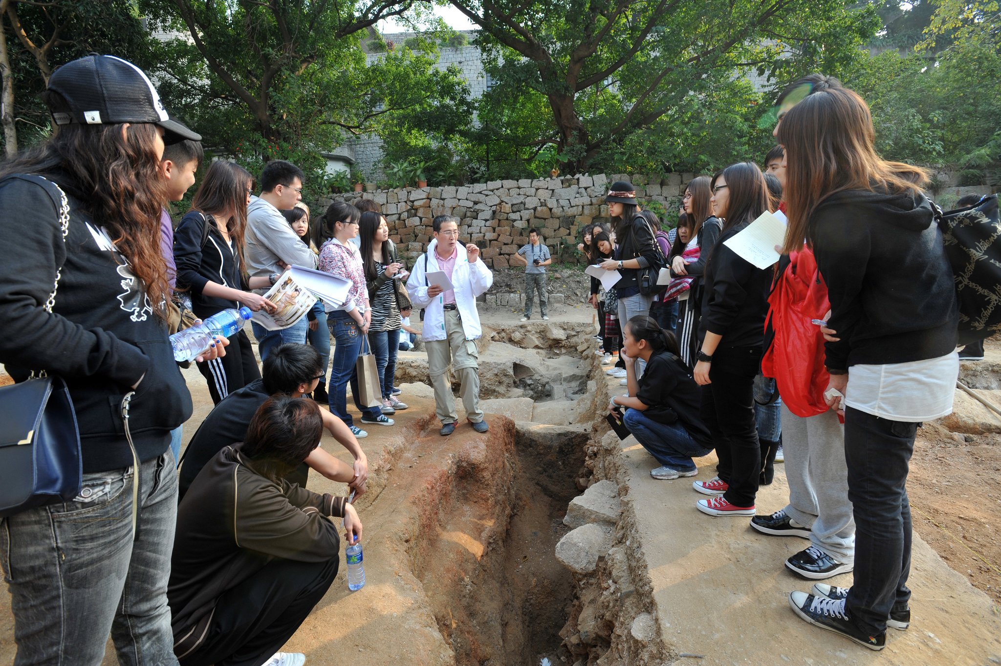 北京中國社會科學院考古研究所漢唐研究室專家朱岩石介紹時指出,聖保祿學院遺址目前挖掘到的大部分文物為明、清時代的磚瓦,初步判斷發現有部分較為完整的清朝瓷片。期間學生就多個有關考古工作的問題踴躍提問,專家逐一給予解答;學生又在專家的指導下手執工具,進行了初步的“撥泥”、“扒沙”、“刮土”、“掃瓦”等基本工作,有學生齊心合力挖掘出半隻破裂的碗底,認真嚴謹的態度和正確的挖掘手法,獲得專家稱讚。