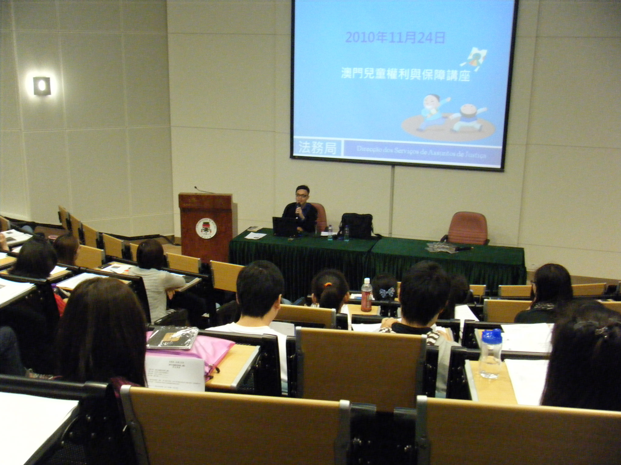 為讓社會大眾對《兒童權利公約》,以至本澳保護兒童方面的相關法律有更深入的了解,確保兒童得到應有的保障及權利,社會工作局開展了一系列「兒童權利公約履約及宣傳」工作,其中包括「澳門兒童權利與保障」大專生培訓講座。社工局於2010年11月19日及24日聯同法務局分別於澳門理工學院及澳門大學舉辦「澳門兒童權利與保障」講座,讓現職大專生能對公約及相關法律有更深入的認識。