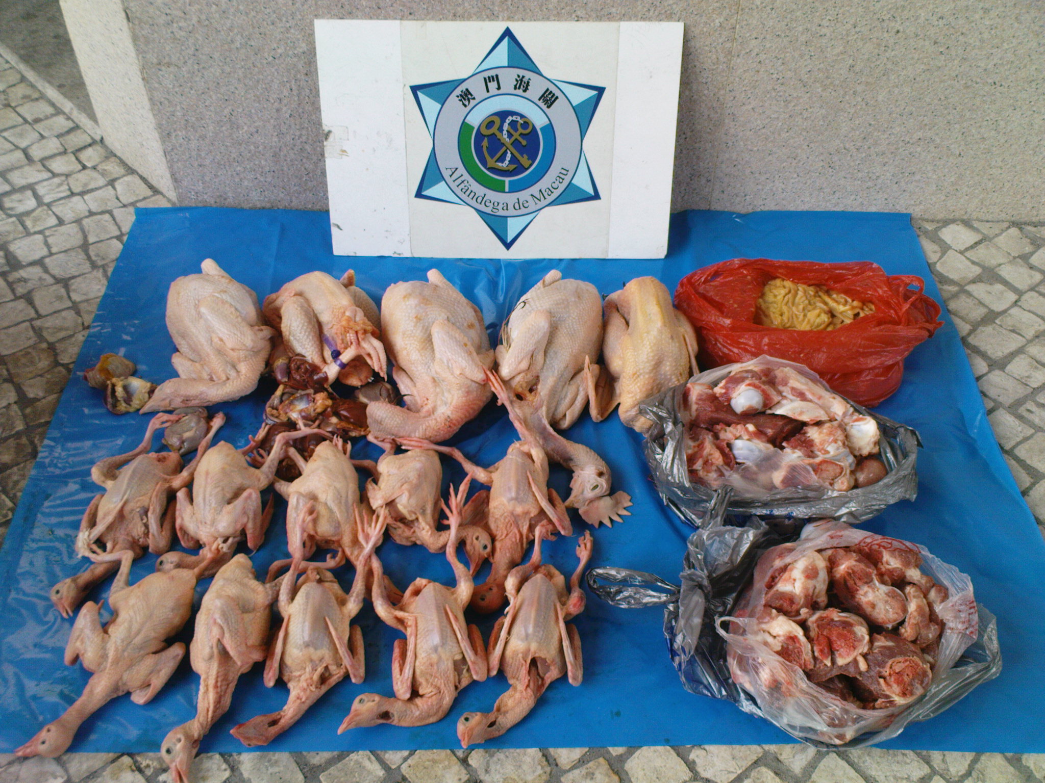 針對一些未經檢疫的肉類流入澳門,澳門海關對入境旅客攜帶肉類活動進行監視,以打擊非法進口肉類活動。今天,海關行動管理關員緝獲一宗非法進口肉類活動,共檢獲22公斤未經檢疫之肉類及已宰家禽。一名收集者被邀往海關總部協助調查。