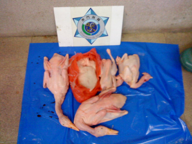 今天上午11時,海關人員發現一名剛從內地返回本澳的澳門女性居民形跡可疑,因此,緊隨其後。當該名女士正進入台山平民大廈時,海關人員採取行動截查該名女士,發現其小腿上捆綁著未經檢疫的已宰家禽。經調查後,該女士辯稱三個月前經朋友介紹為關閘附近某一食肆到珠海口岸市場提取已宰家禽,並在提貨時收取帶工費,每隻澳門元4元。其後,將未經檢疫之已家禽帶回本澳,並放於指定地點即可,而每次地點都有所不同。