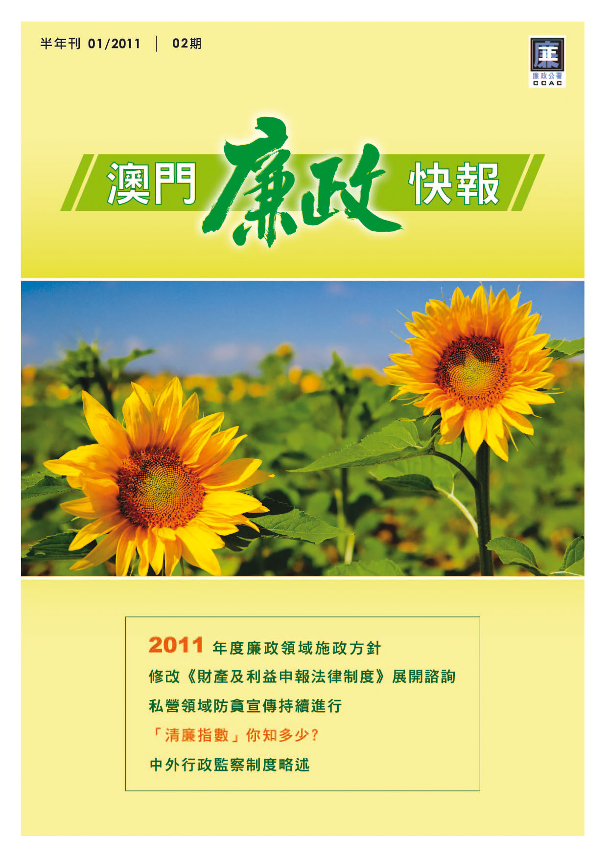澳門廉政公署出版的半年刊《澳門廉政快報》第2期經已發行,市民可透過廉署網頁(www.ccac.org.mo)瀏覽有關內容,或於指定地點免費索取。