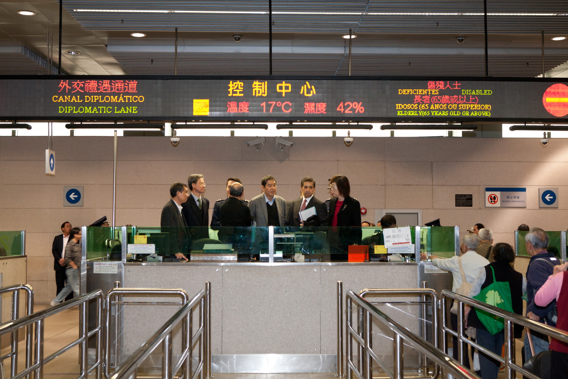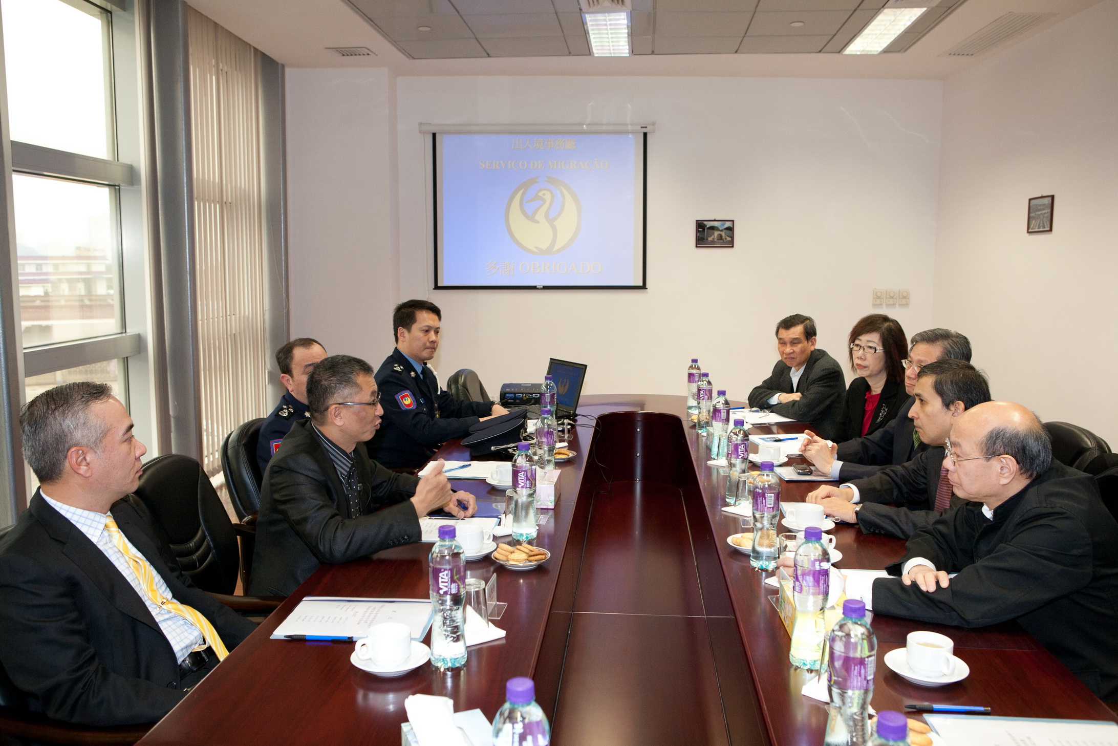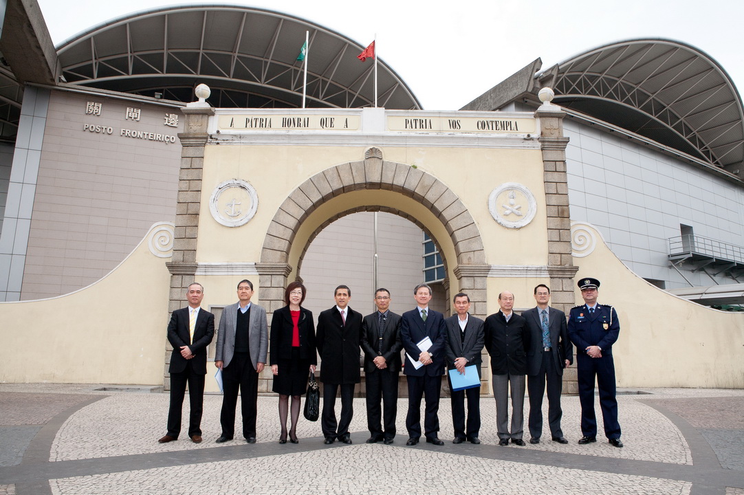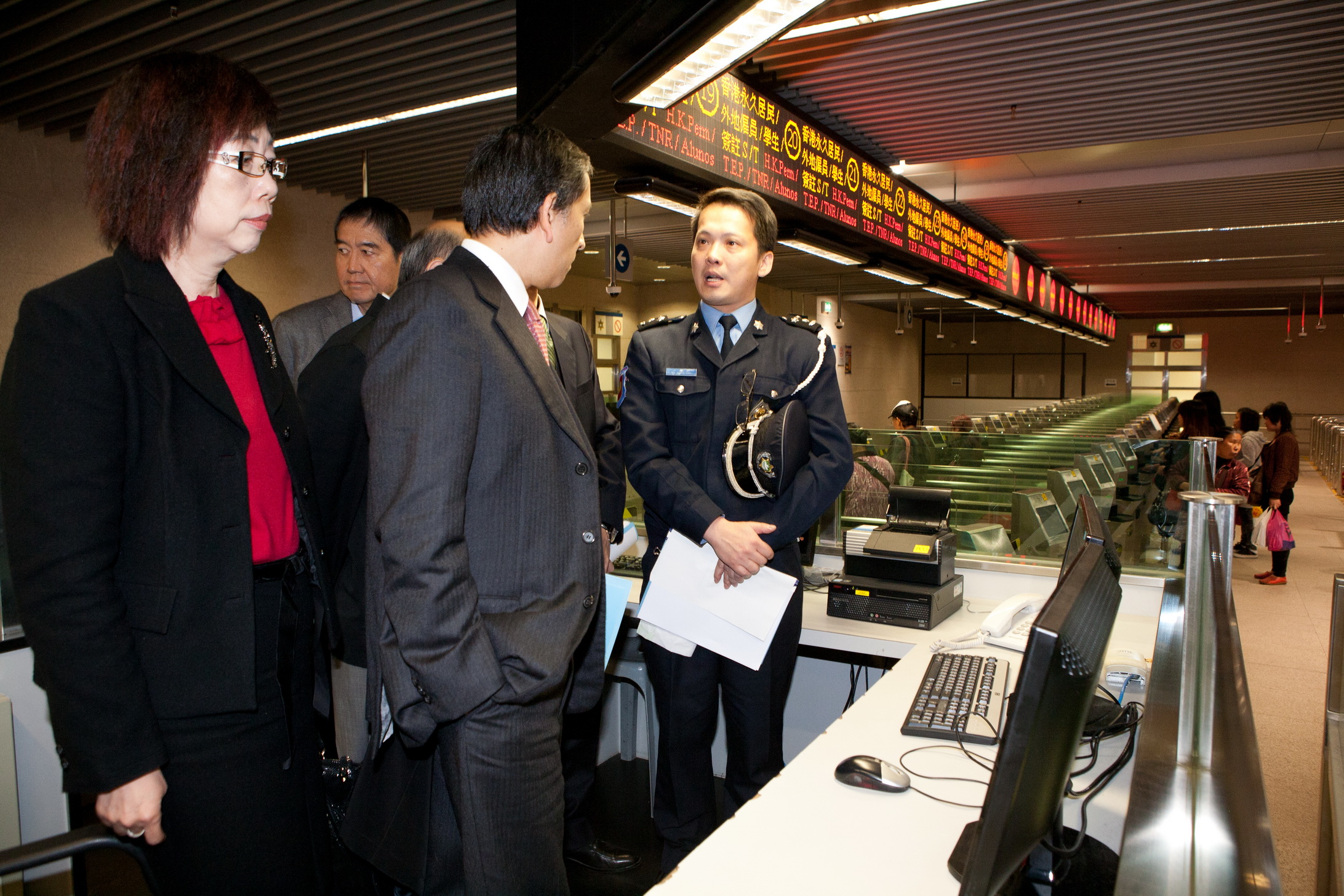 紀監會一行八人上午抵達關閘邊檢站,李小平局長、毛傲賢副局長、出入境事務廳廳長飛能地親切接待並同行講解。參觀團首先在關閘邊檢站聽取該單位的架構及職能簡介,隨即視察離境及入境驗證櫃台、自助過關通道、簽證室、調查室及相關的出入境設施。該邊檢站就出入境監控、入境簽證措施、販賣人口調查以及旅遊證件核查等具體工作進行講解,紀監會對該部門運作表示關注並積極提出了問題和意見。