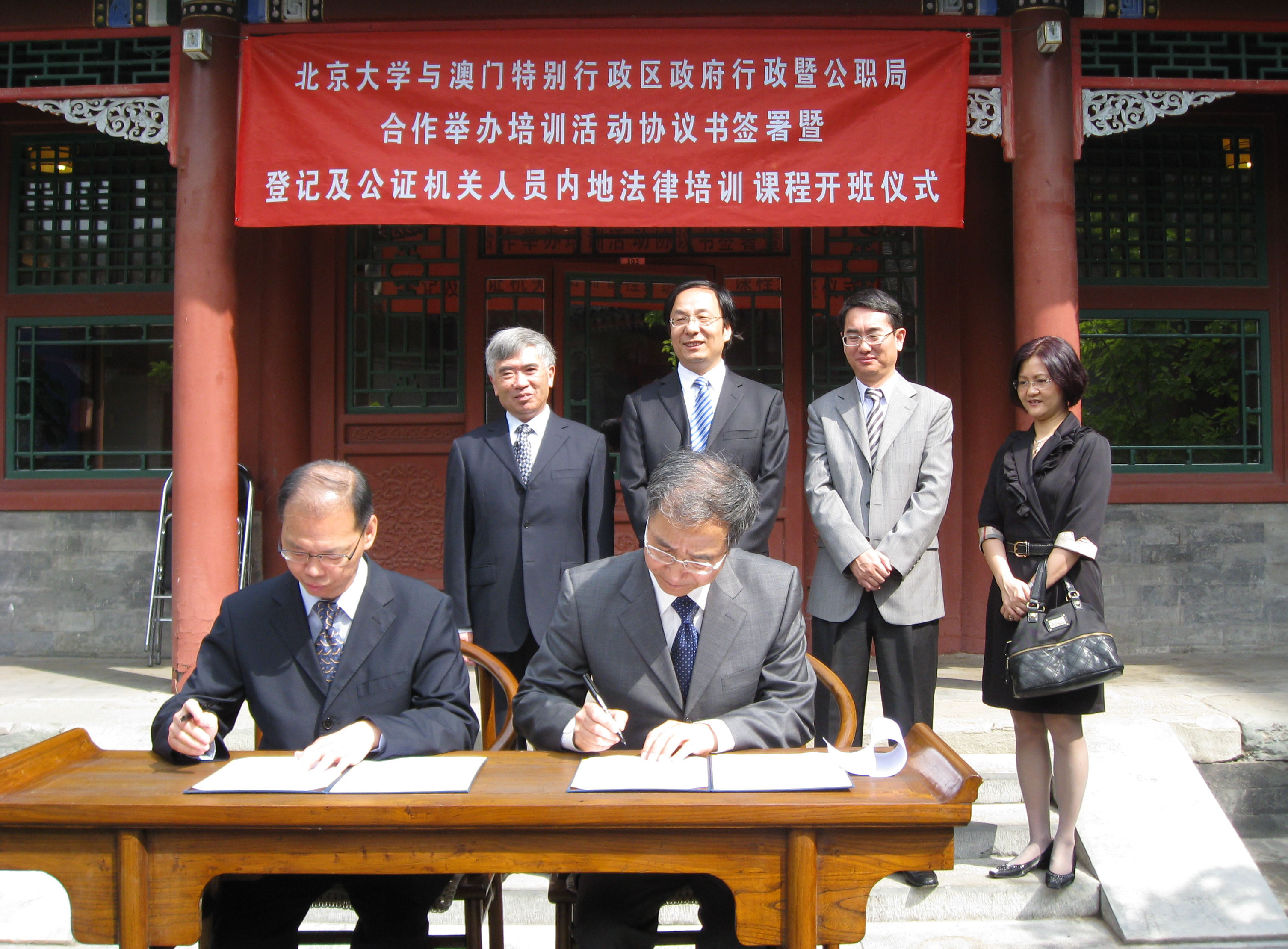 簽署儀式在北京大學舉行,由行政暨公職局局長朱偉幹與北京大學港澳研究中心主任饒戈平共同簽署。出席簽署儀式者包括國務院港澳事務辦公室聯絡司周俊司長、北京大學教務委員會副主任林鈞經教授、法務局局長張永春、行政暨公職局副局長楊儉儀、北京大學港澳研究中心常務副主任張世功教授,以及多位北京大學法學院領導及教授。