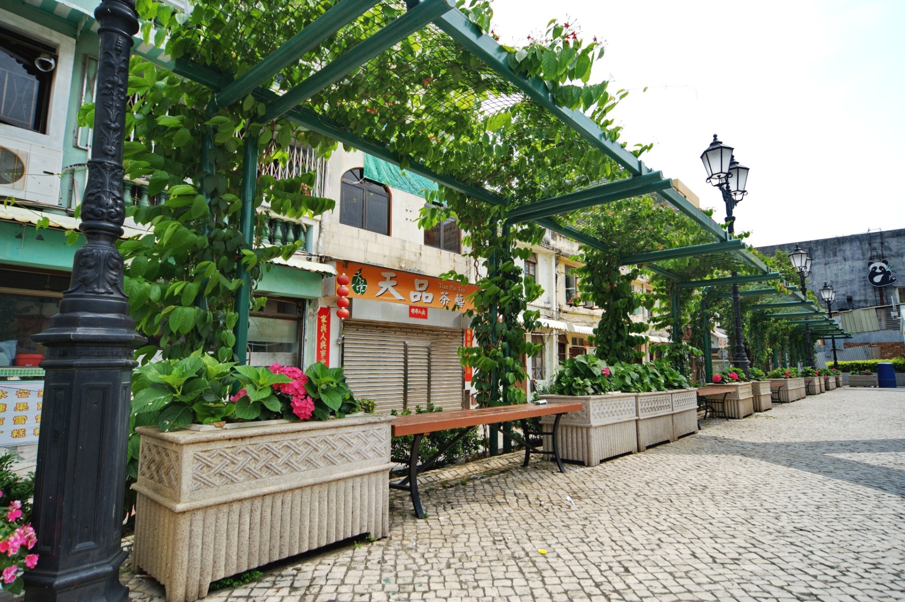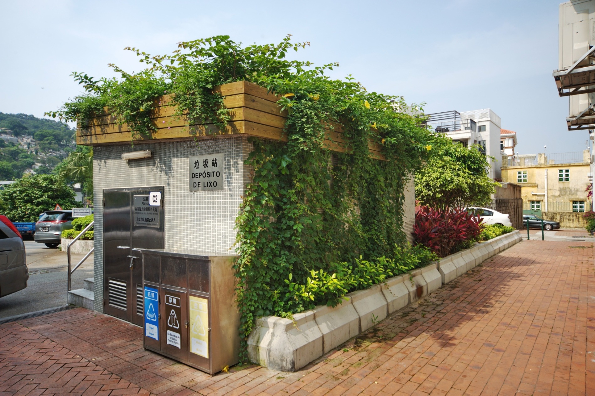 今年初完成了五個垃圾房頂的綠化和加設一道綠涼棚,其中三個垃圾房在中區南灣大馬路一帶鬧市,另外兩個在路環舊城區內,而綠涼棚則設置在氹仔舊城區。有關垃圾房的綠化是透過採用掛盆方式,在垃圾房頂擺設花盆及安裝滴灌灑水系統,節省人力及用水量。盆內種植了簕杜鵑、軟枝黃嬋及紫花馬纓丹等多個品種,形態、花色及花期各異,特意設計在全年大部份時間都長滿了青翠綠葉及開著鮮艷的花朵。將原本不起眼的垃圾收集設施進行綠化改造,使之成為澳門城市綠化的一個特色。