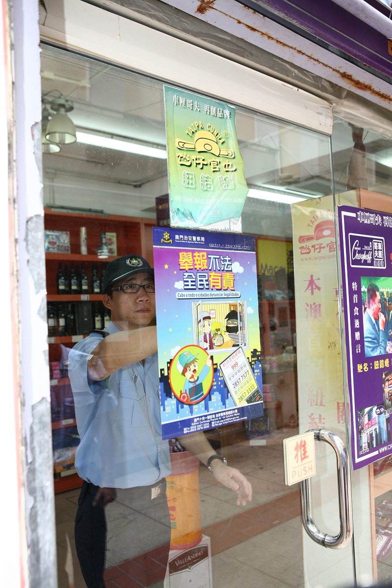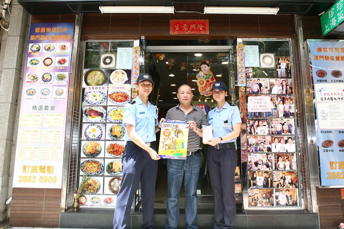 今天早上11時正,本局公共關係處源劍鋒副警司及劉國熙副警司、連同氹仔警務警司處李德輝副警司到官也街一帶食肆及手信店進行防扒竊宣傳工作,向遊客及居民派發“提防小手”小冊子、講解常見的扒竊手法、提醒注意自身財物的安全,呼籲遊客在有需要時應報警求助,以免讓不法份子消遙法外;另外,亦得到附近商鋪負責人的支持,在多間食肆及手信店內張貼“提防小手”海報,提高防罪意識,並即場對財物外露的店鋪顧客作出溫馨提示,讓其了解正確的保管財物方法。其後,宣傳小組人員分別移師南新花園及雍景灣對開巴士站繼續進行宣傳活動,提醒居民及遊客在乘車或候車期間應注意自身財物的安全,有需要可報警求助。