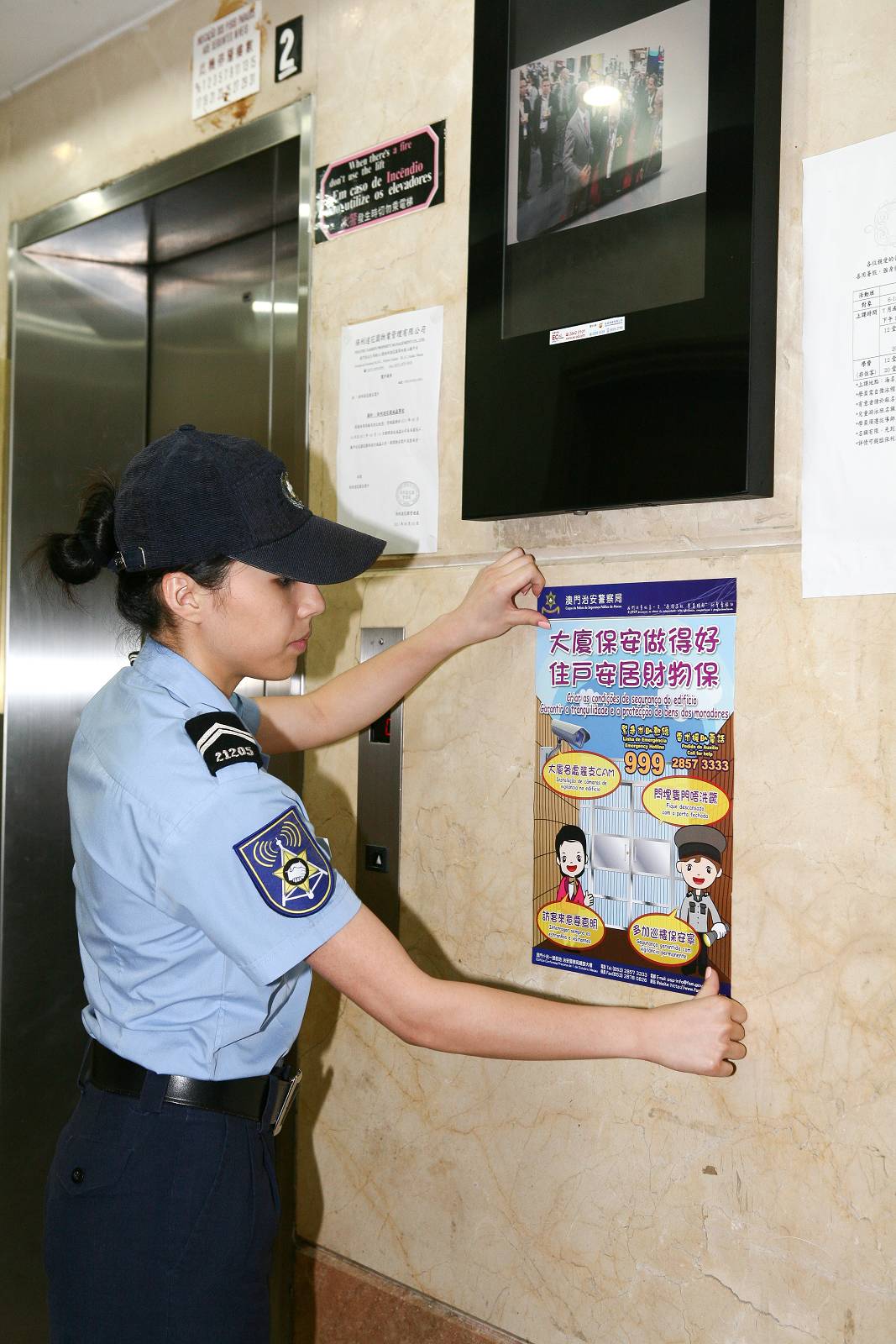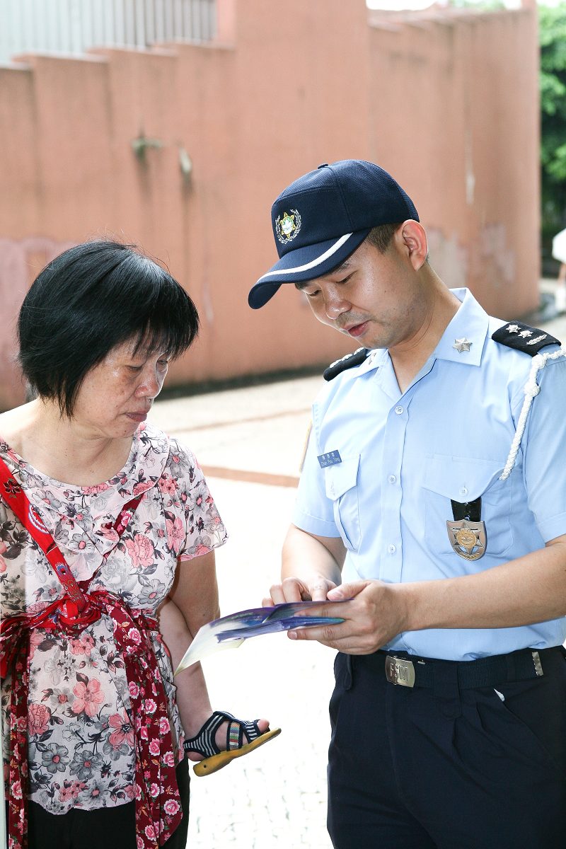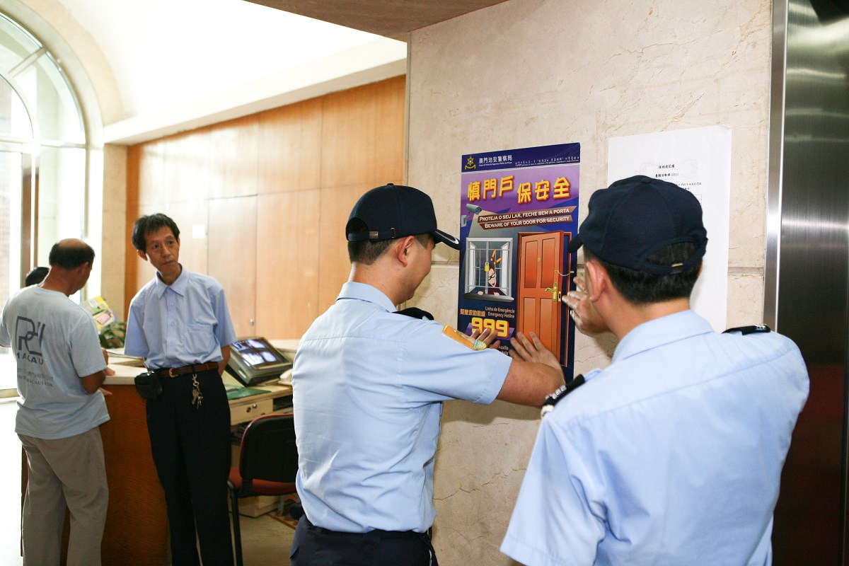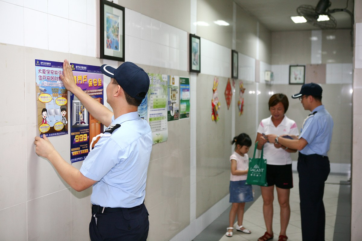 今天上午,本局公共關係處副警司黃超文及澳門警務廳副警司陳溥棠到澳門東北區保利達花園及廣福祥花園進行大廈滅罪宣傳工作,向居民派發“慎防門戶保安全”小及“舉報不法.全民有責”小冊子,講解常見大廈犯罪情況,提醒注意家居安全,同時暑期外出旅遊時須注意加強防盜措施;呼籲住客守望相助,管理員及住客遇到犯罪及可疑情況應報警求助,勿讓不法份子消遙法外;宣傳亦得到大廈管理處及食肆的支持,在十多幢大廈及食店、商店內張貼宣傳海報,提高防罪意識。此外,亦對圍繞屋苑範圍的市民、行人等宣揚防治犯罪、警民合作的訊息。整項宣傳活動由11時開始至12時半左右結束。