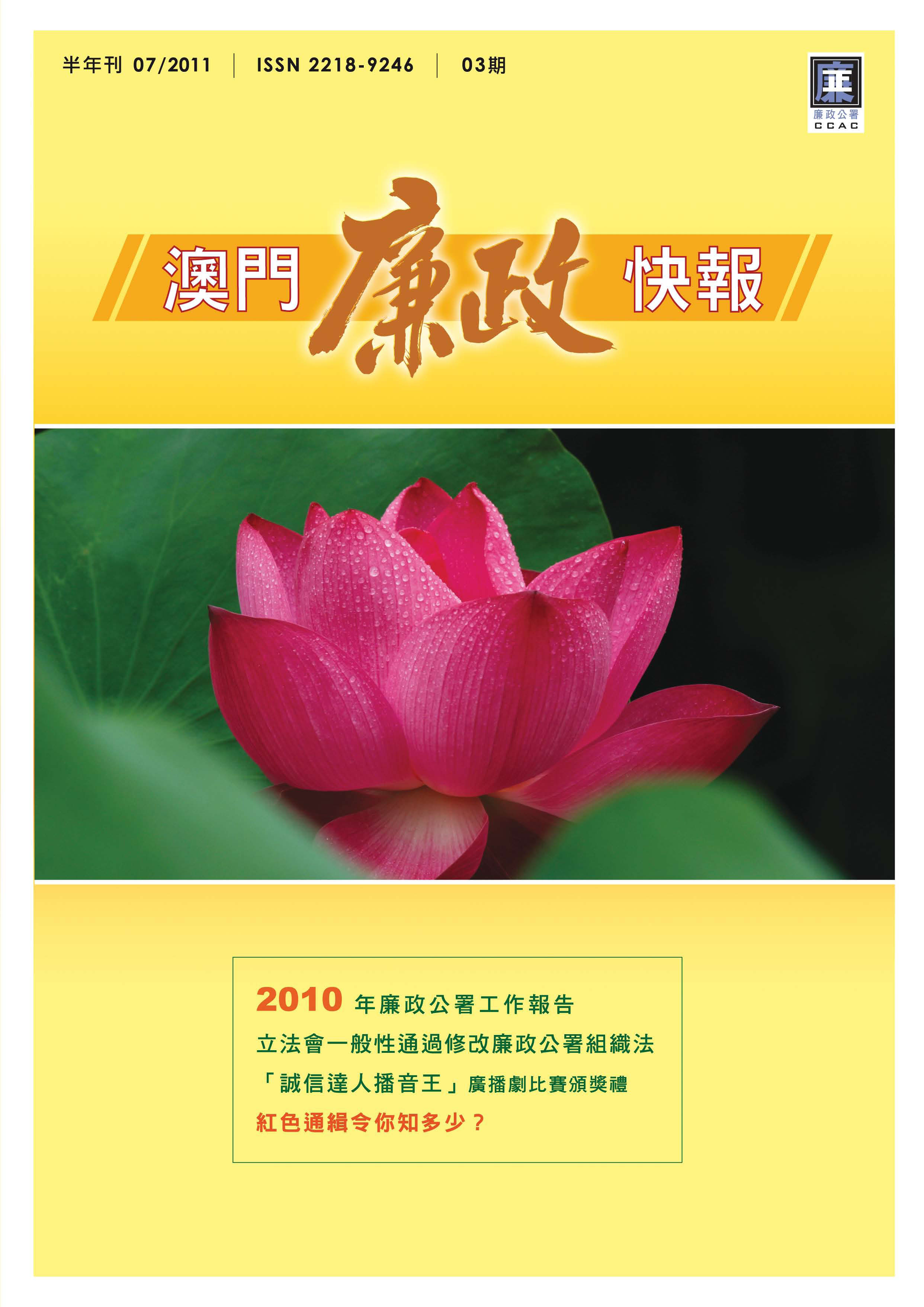 澳門廉政公署出版的半年刊《澳門廉政快報》第3期經已發行,市民可透過廉署網頁(www.ccac.org.mo)瀏覽有關內容,或於指定地點免費索取。