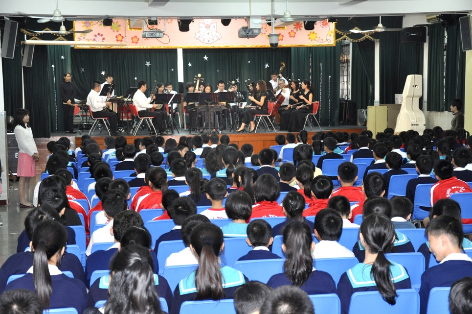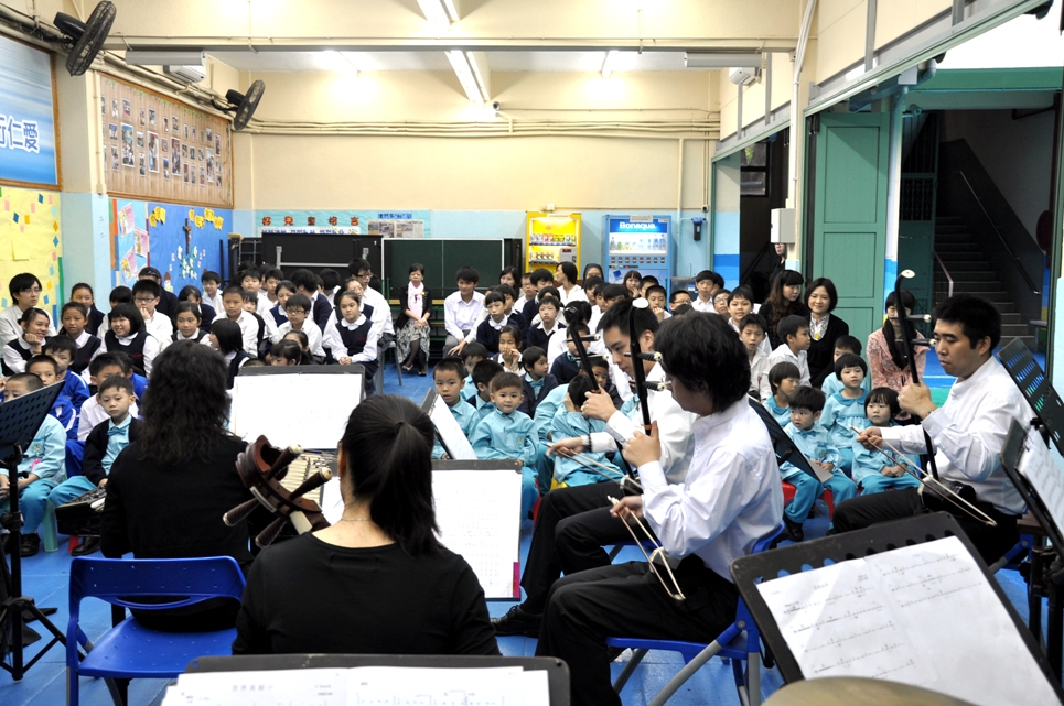 澳門中樂團在聖德蘭學校及瑪大肋納嘉諾撒學校奏演了 《哆來咪》、《鈴兒響叮噹》、《小星星》、《多拉A夢》、《月亮代表我的心》、《世界真細小》等富趣味性的樂曲。由於參加的學生為小一至小六年級生,大多表現雀躍,輕唱附和,十分投入。