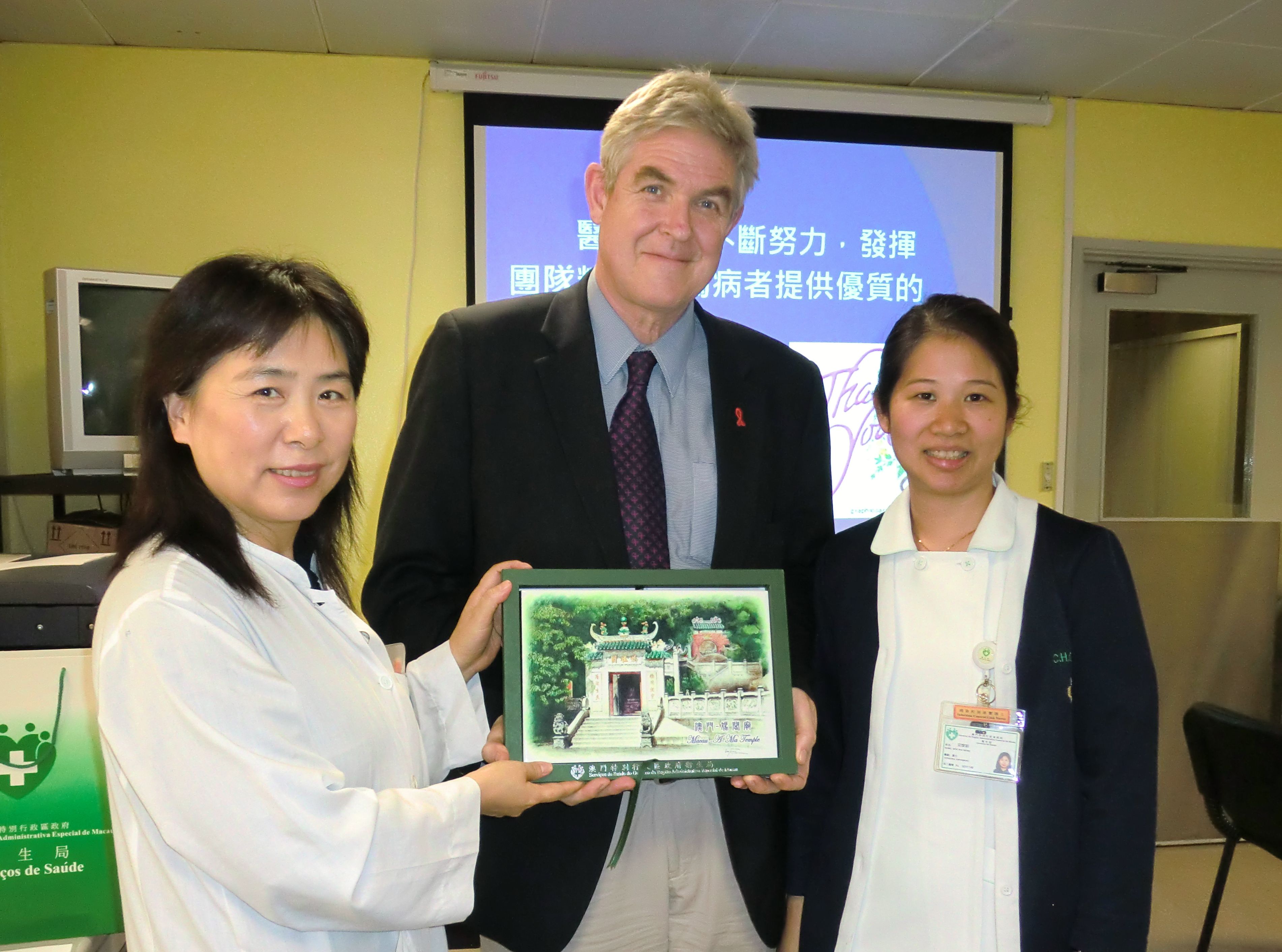 聯合國愛滋病規劃署駐華辦事處主任馬克(Mark Stirling)先生日前出席了澳門特別行政區政府防治愛滋病委員會舉辦的”在一起”世界愛滋病日反歧視防愛滋紀錄片首映暨座談會後,與防治愛滋病委員會及防治愛滋病相關的非政府機構代表會面,並視察了仁伯爵綜合醫院感染科、社工局戒毒綜合服務中心、澳門戒毒康復協會。馬克先生贊揚本澳在跨部門合作、社區參與、監測和綜合性的減害措施方面取得的成功,值得其他地方借鑑。