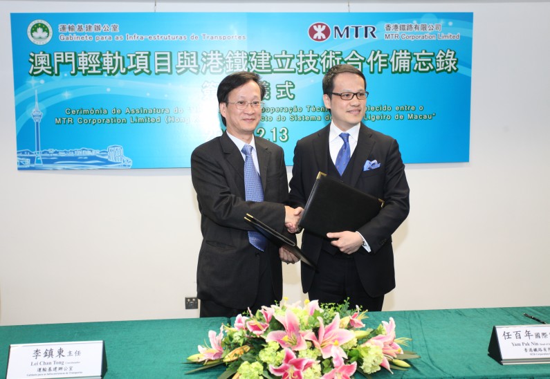 運輸基建辦公室與香港鐵路有限公司簽署「澳門輕軌項目與港鐵建立技術合作備忘錄」,加強港澳兩地就軌道交通系統的技術支援及合作;優化建設及管理項目,進一步提升本地人員的專業技能。