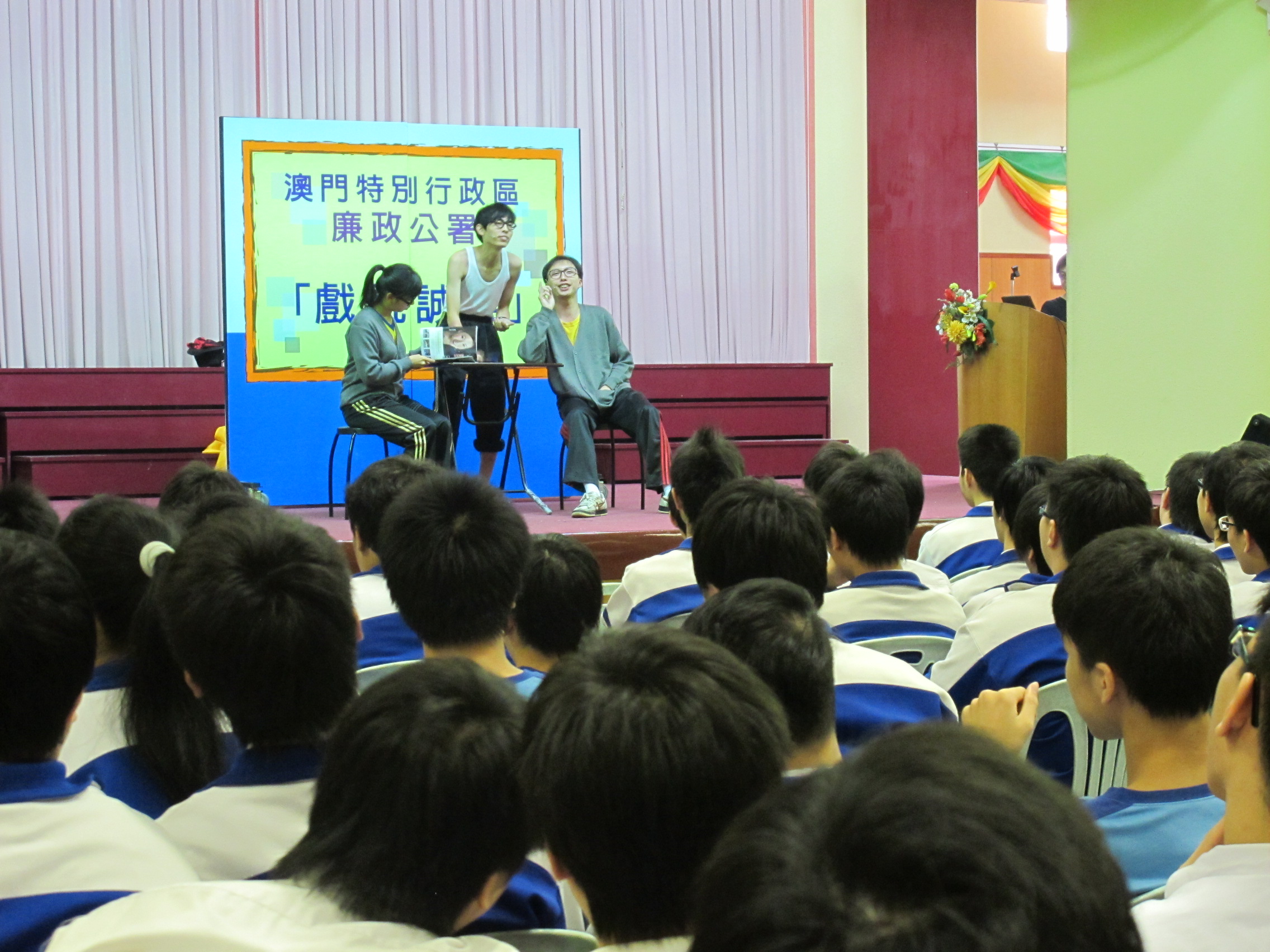 廉政公署於11至12月期間在本澳中學推行「戲說誠信」活動,透過戲劇表演的方式,向中學生傳遞正確的誠信價值觀和廉潔守法的精神,是項活動受到本澳學界的歡迎。