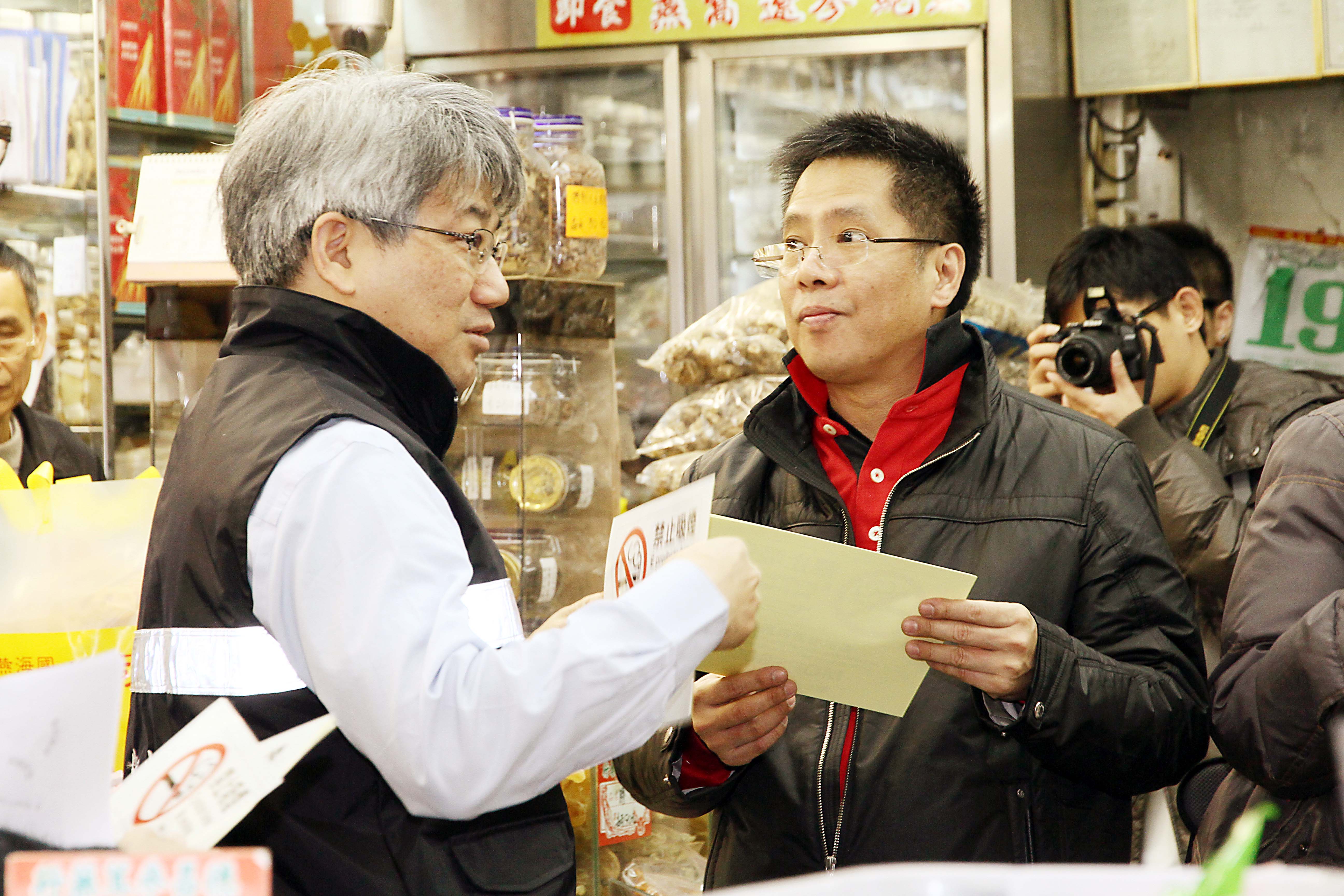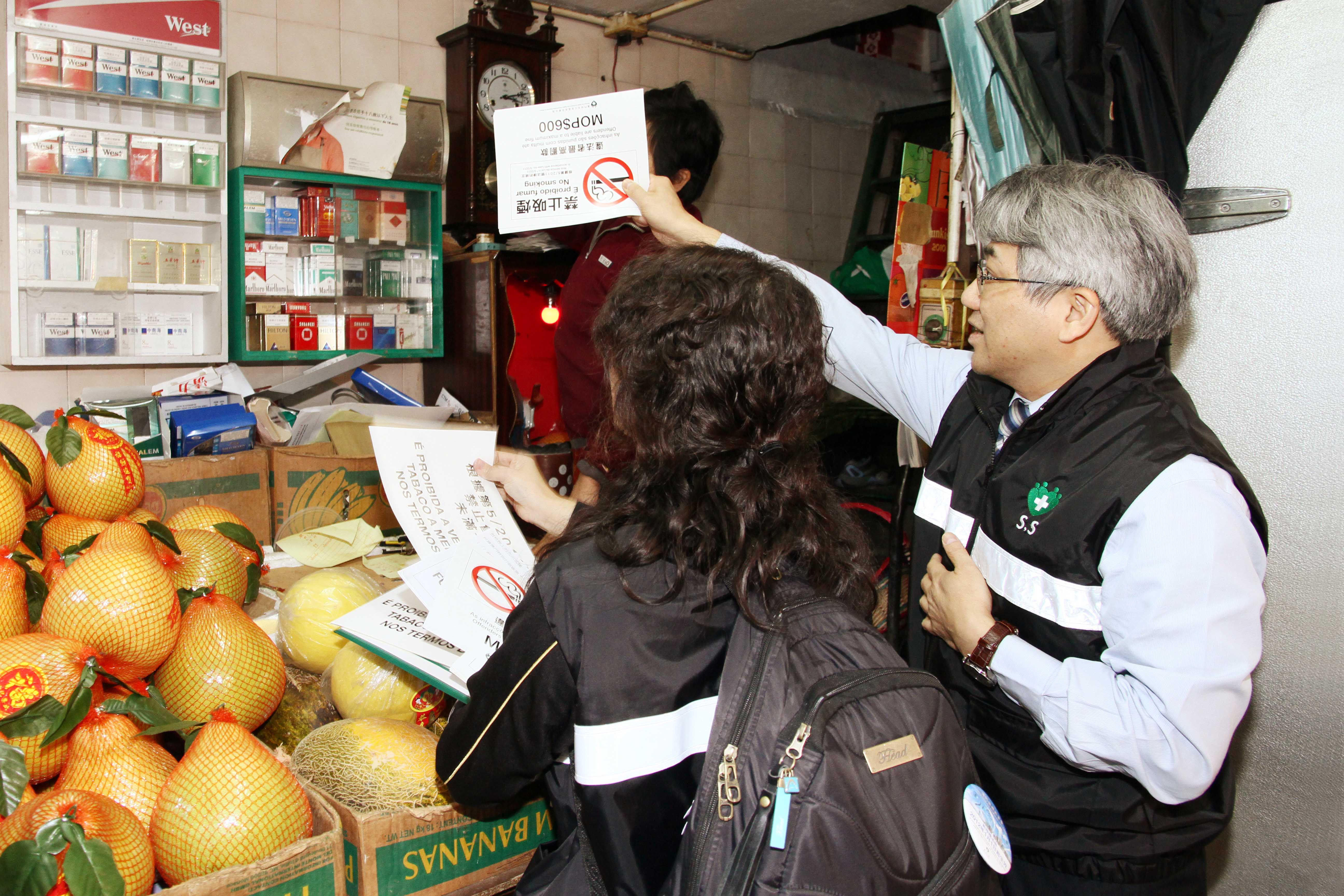 為加強商鋪對《新控煙法》的瞭解,衛生局李展潤局長、鄭成業副局長及疾病預防中心湯家耀主任,聯同預防及控制吸煙辦公室李兆田主任及多位衛生督察,一同穿上控煙督察的制服於19日下午到中區水坑尾一帶,沿途向各商鋪派發禁煙標誌並向商鋪解釋《新控煙法》的相關規定。