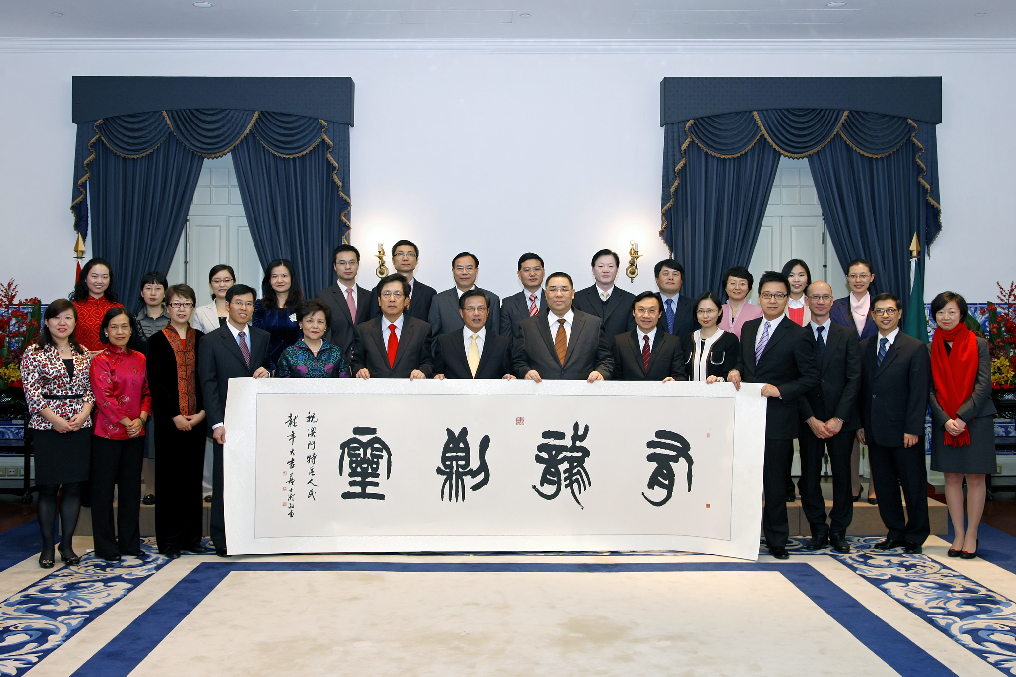 胡特派員向行政長官贈送了“有龍則靈”四個大字。這幅墨寶由中國書法家協會副主席蘇士澍先生應外交公署之邀特地為特區政府書寫,表達了外交公署對澳門同胞的深情祝福。