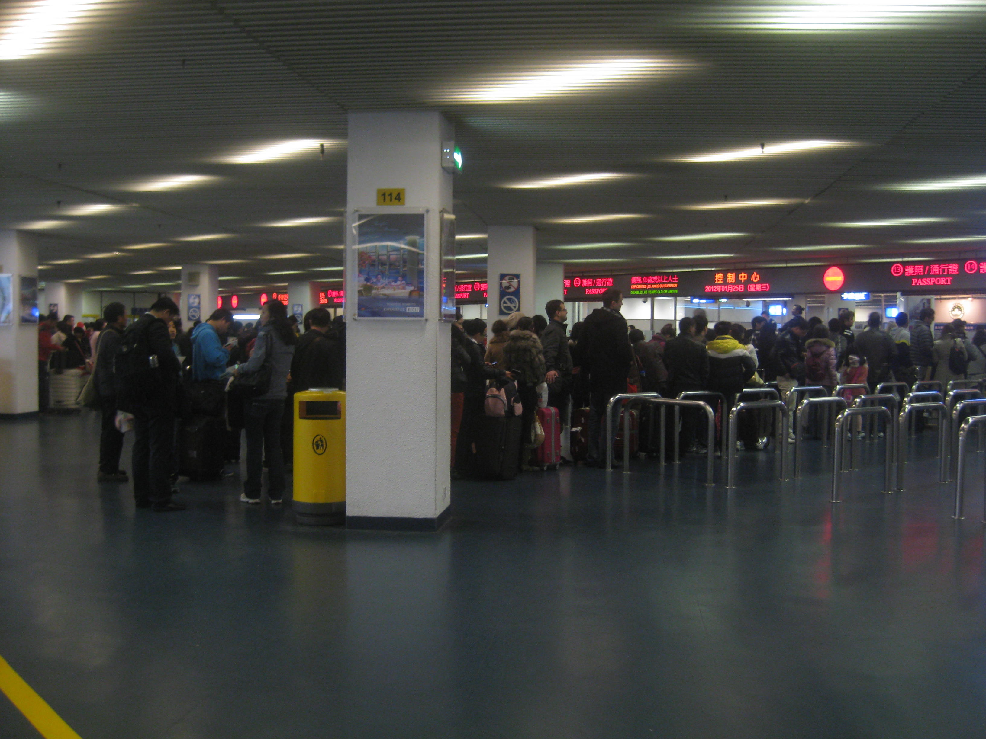 為應對旅客出境高峰潮,港務局已提早於1月19日將有助維持秩序的入境人流管理措施擴展至離境候檢區域,於該區域設置以膠馬組成圍欄來控制離境人流,同時設置指示牌及訊息廣播,分流澳門居民及已登記自助過關人士到自助過關系統區域,將大部分櫃台用作處理持其他旅遊證件人士,以縮短通關時間。此外,因應旅客人數的增加,治安警察局出入境事務廳亦儘量抽調人手增開驗證通道,及時疏導過關旅客。