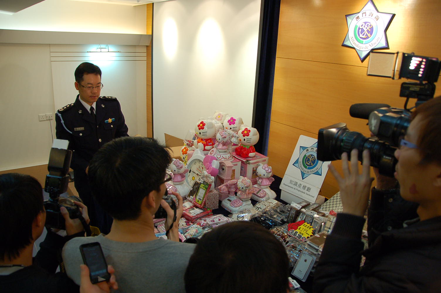 澳門海關接獲由消費者委員會轉介之投訴個案,指位於大三巴旅遊區某兩間【精品廊】涉嫌售賣假冒“HELLO KITTY”人物公仔。海關收到舉報資料後,立即展開深入調查,並核實該品牌商標已在澳門特區政府經濟局作出合法註冊登記。
