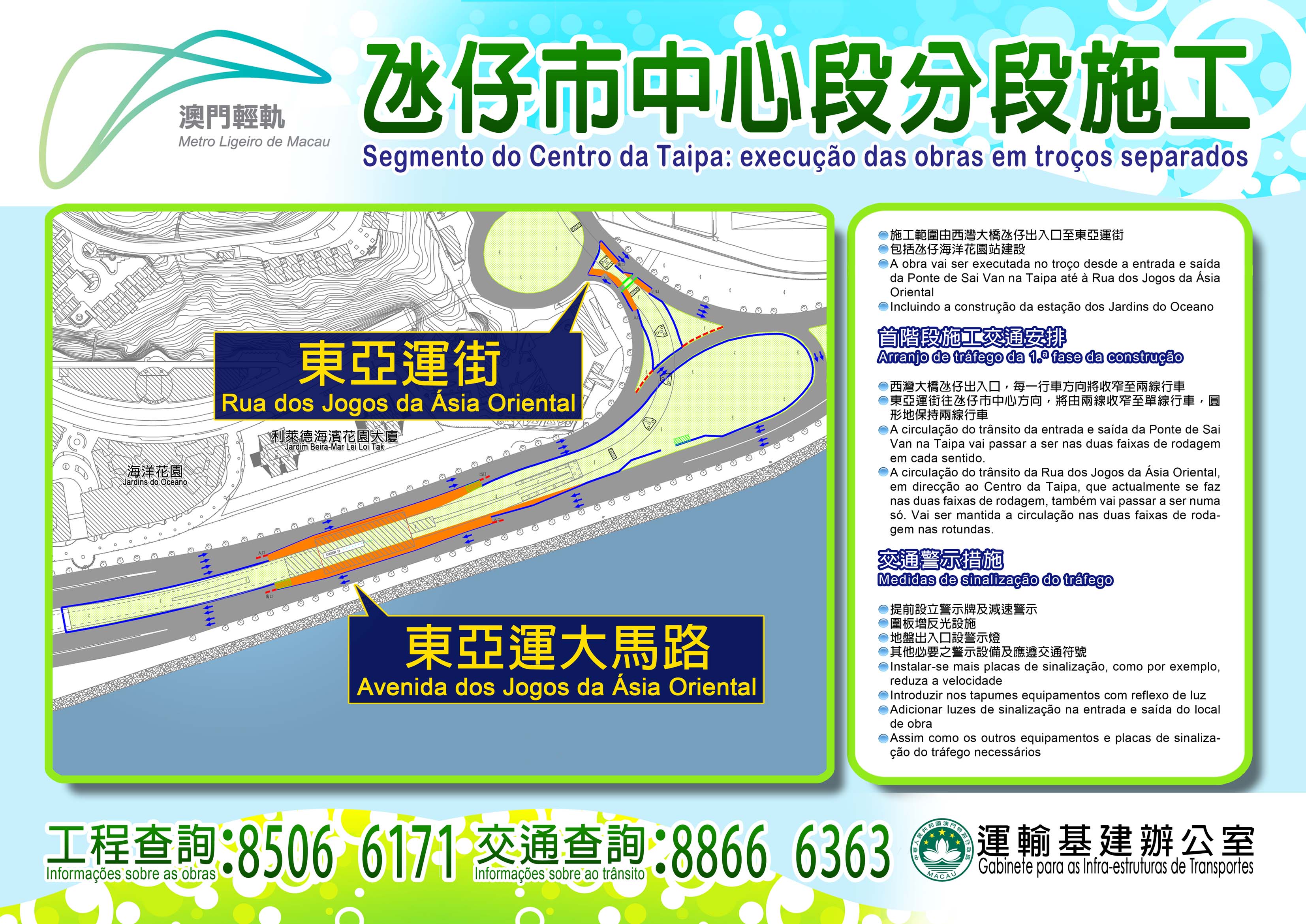 運輸基建辦公室聯同交通事務局及環境保護局,17日舉行新聞發佈會介紹澳門輕軌氹仔市中心段施工安排。氹仔市中心段全長1.94公里,包括海洋花園、澳門賽馬會、澳門運動場和舊城區4個車站,涵蓋的施工範圍包括東亞運大馬路、東亞運街、盧伯德圓形地、柯維納馬路、運動場圓形地、運動場道、奧林匹克游泳館圓形地及望德聖母灣大馬路,總工期約39個月。