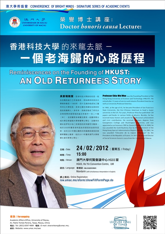 澳門大學將於二月二十四日舉行榮譽博士講座“香港科技大學的來龍去脈-一個老海歸的心路歷程”,世界著名的物理學家和教育家、澳大榮譽博士吳家瑋教授將擔任主講嘉賓,分享其幾十年來於科技和教育方面的寶貴經驗。