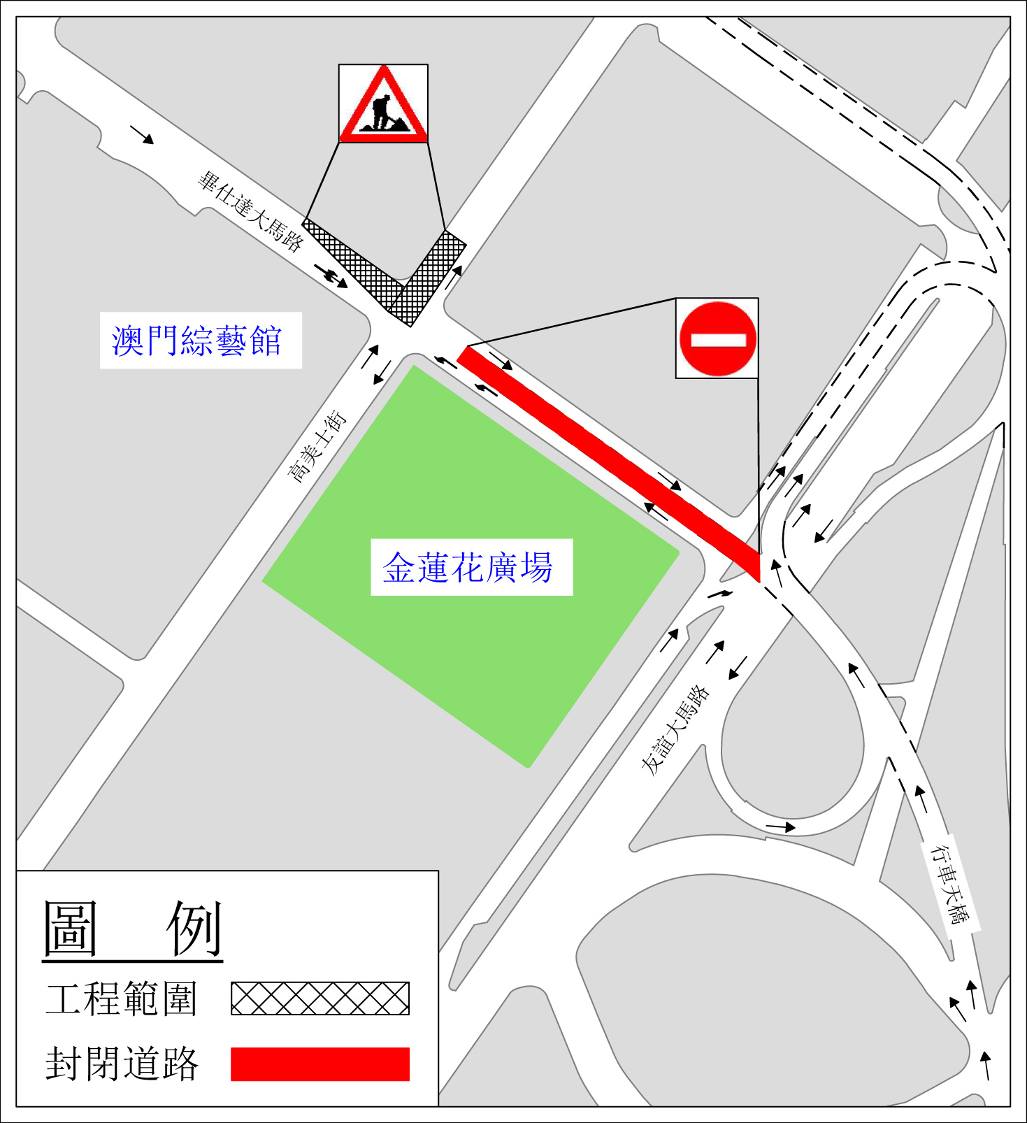 配合民政總署進行渠網改善工程,友誼大馬路行車天橋往畢仕達大馬路方向的引橋周日(4日)上午11時起臨時封閉,禁止車輛駛進,工程為期25日。期間高美士街及畢仕達大馬路近外交部駐澳特派員公署的路段將實施有限度通車,交通事務局呼籲駕駛者留意。