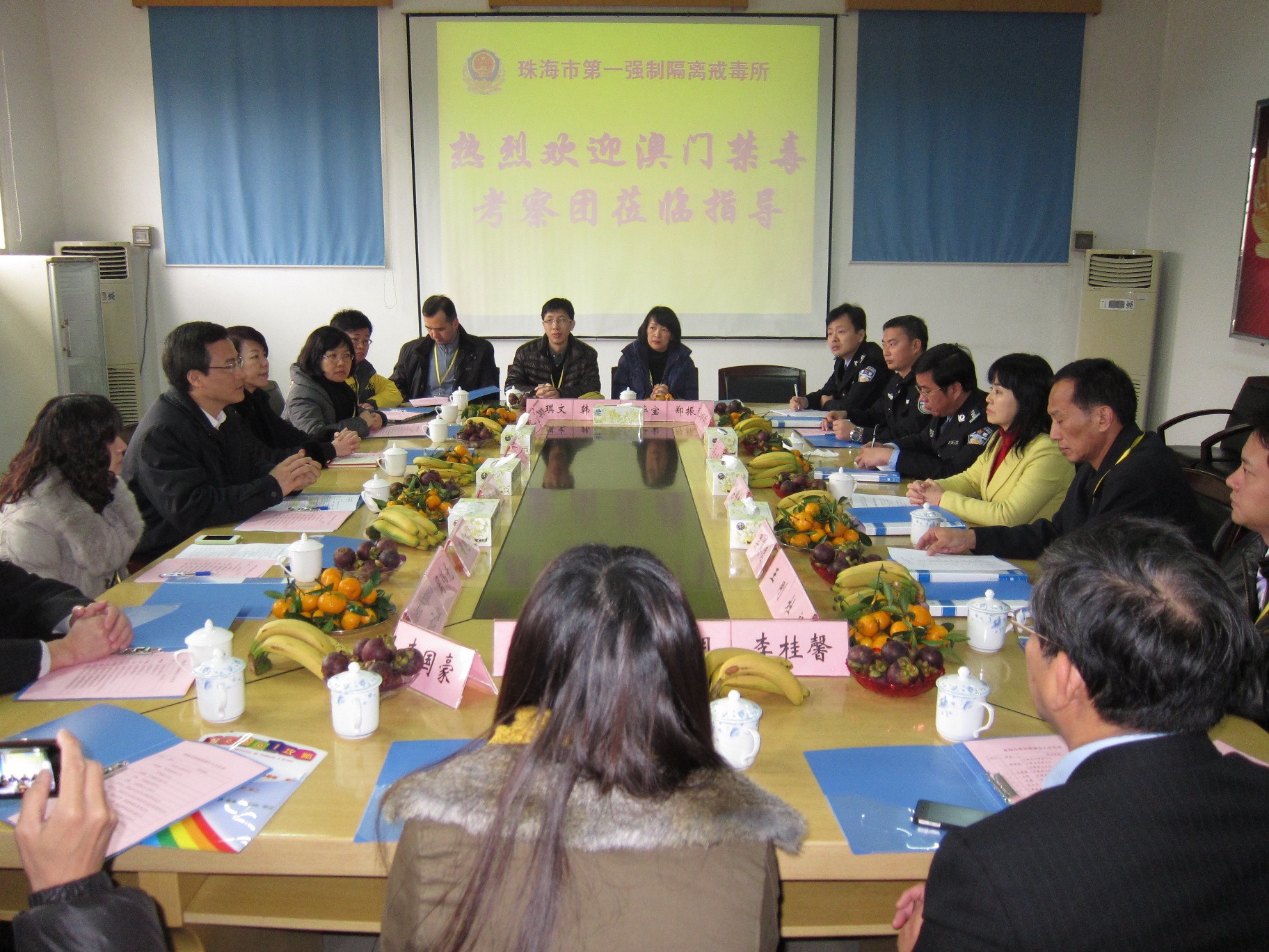 考察團成員還包括社會工作局黃艷梅副局長、社會文化司司長辦公室何麗鑽顧問、司法警察局周偉光副局長、教育暨青年局周佩玲主任、澳門戒毒康復協會Augusto P.V. Nogueira主席、聖公會澳門社會服務處李國豪總監、澳門中華教育會鄭洪光秘書長、澳門醫護志願者協會白琪文會長、澳門婦女聯合總會蘇云玉副主任、潘志明先生,以及社會工作局防治藥物依賴廳主管人員。考察期間獲廣東省禁毒委員會辦公室、珠海巿禁毒委員會辦公室及強制隔離戒毒所各級領導之熱情接待,會議上就目前所面對之毒品問題進行了深入討論和交換意見。珠海方面表示十分重視跨境濫藥問題,嚴格監管娛樂場所,對有吸毒販毒之娛樂場採取嚴厲處罰,甚至勒令停業。在新型合成毒品之控制方面,雙方都認為單從打擊是無法解決所有問題,預防工作同樣重要。