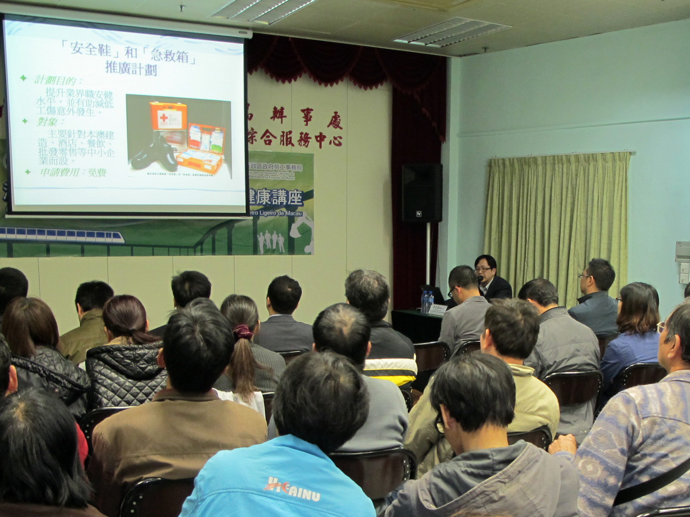 講座由勞工事務局職業安全健康廳推廣訓練處代表主講,九十分鐘的講座內容包括介紹澳門現行職安健法例、承建商與工作人員的義務、露天挖掘工程、高空工作與工作平台、個人保護裝備等針對輕軌工程之安全施工規定,勞工事務局向業界呼籲,於輕軌工程進行期間,承造商、安全督導員與工作人員必須做好相應的預防措施,確保安全施工,以預防工作意外與職業病的發生。
