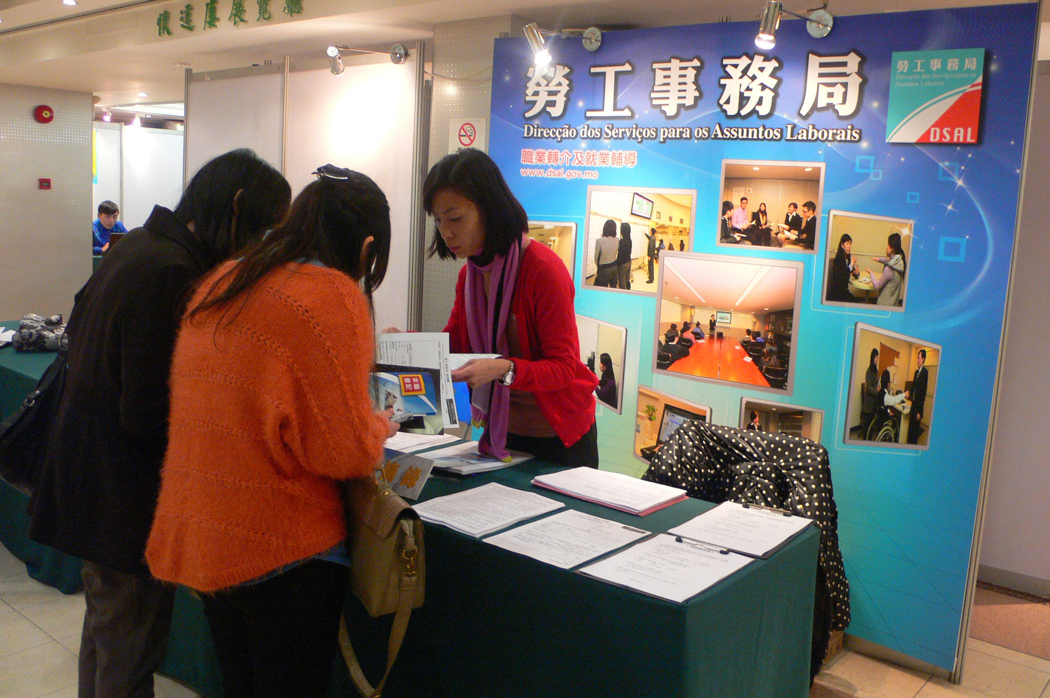 勞工事務局於上月參加澳門理工學院〝2012就業發展日〞,設置就業服務展覽攤位及舉行〝夢想「職」達〞就業講座,為學生提供就業服務資料及就業輔導講座。